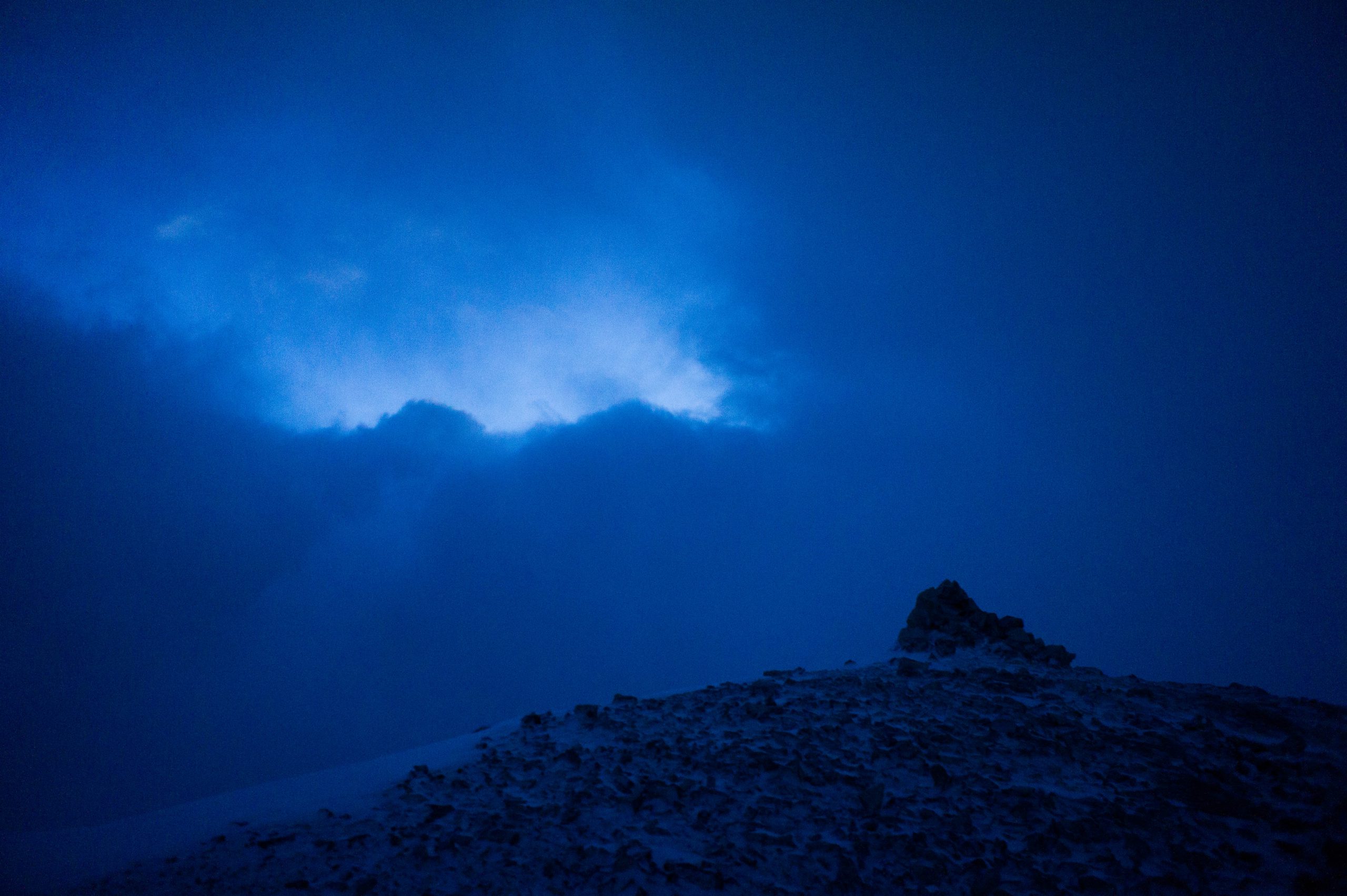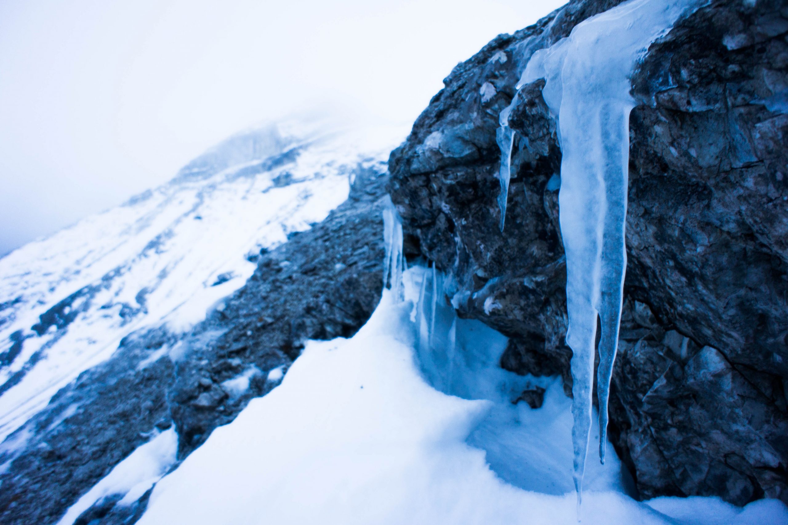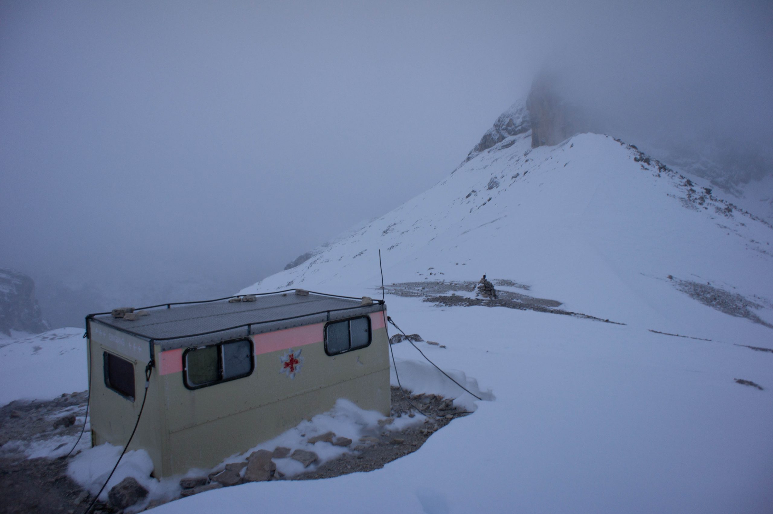 Um fünf Uhr morgens weckt mich ein schepperndes Geräusch. Der Wind hat aufgefrischt und lässt die Eingangstüre, die ein bisschen locker sitzt, gegen den Rahmen schlagen. Zudem ist ein klatschendes Geräusch zu hören – Nassschnee patscht fast horizontal an die Biwakschachtel.
