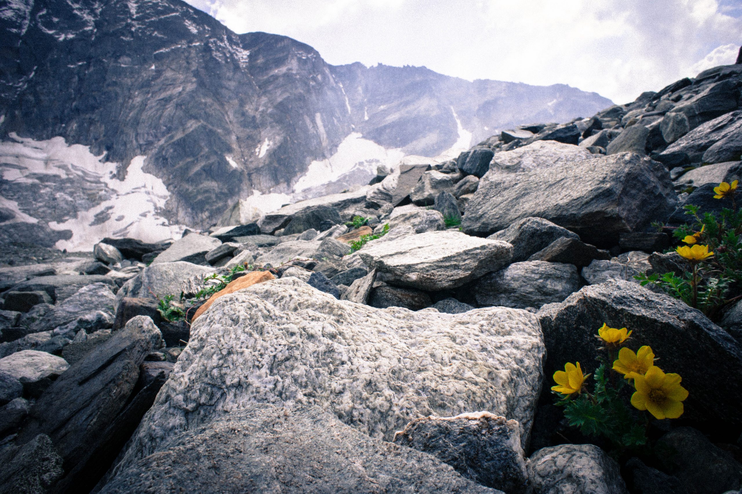 Das Ödenwinkelkees hat sich, im Vergleich zu unserer AV-Karte, weit zurückgezogen. Es dauert lange, ehe wir nach viel Geröll, Schutt und Pionierbewuchs endlich den schuttbeladenen Gletscher betreten. Doch wo geht es jetzt am besten lang?