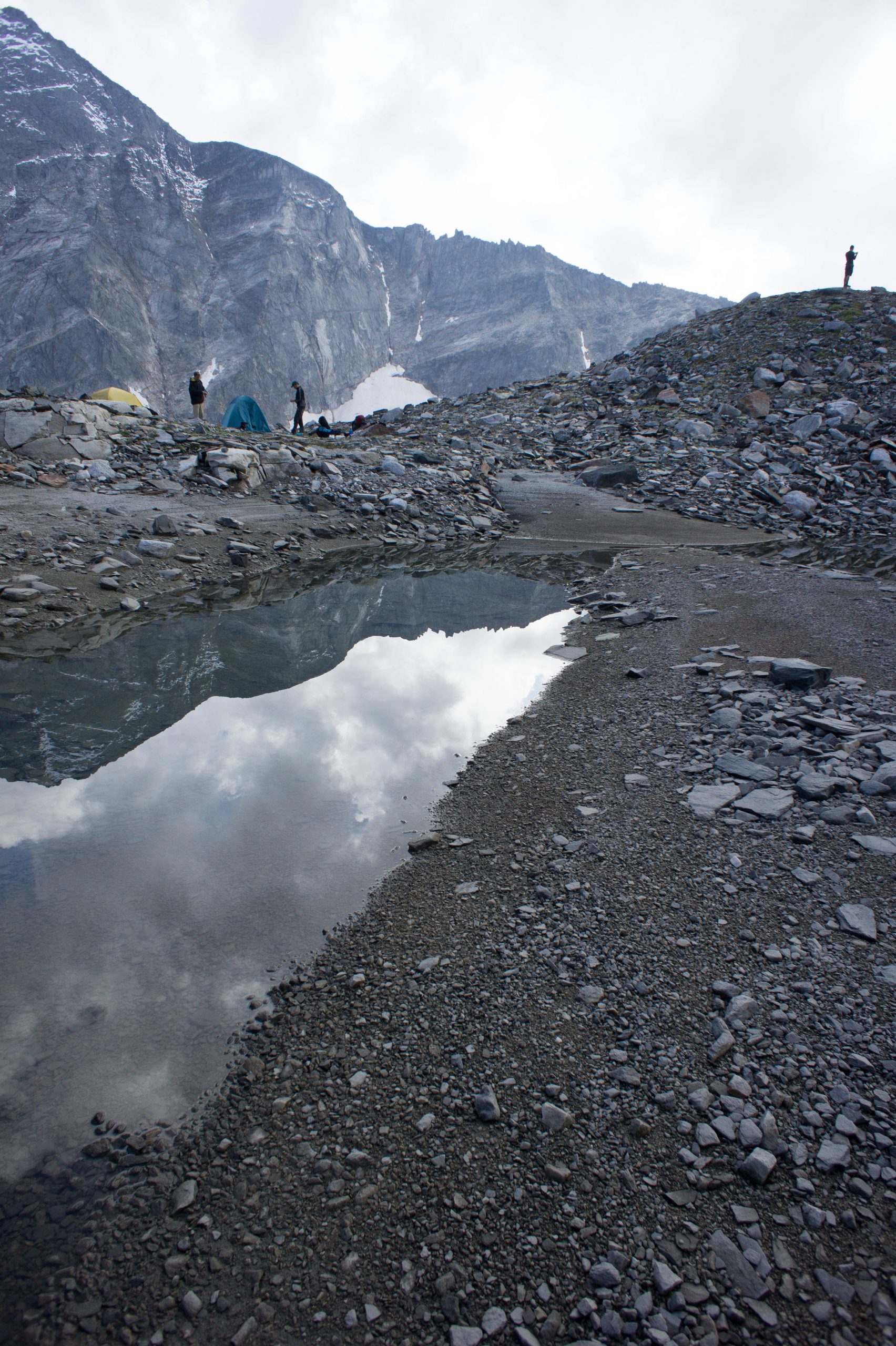 Um dorthin zu kommen, müssen wir allerdings eine äußerst bröselige Randmoräne hinauf – mit dem schweren Rucksack kein gerade leichtes Unterfangen. Ein Schritt vor, zwei zurück… Langsam wird das Gelände jedoch flacher. Wir finden traumhafte Zeltplätze und, nach kurzer Suche, ein besonders schönes Plätzchen an einem kleinen Tümpel.