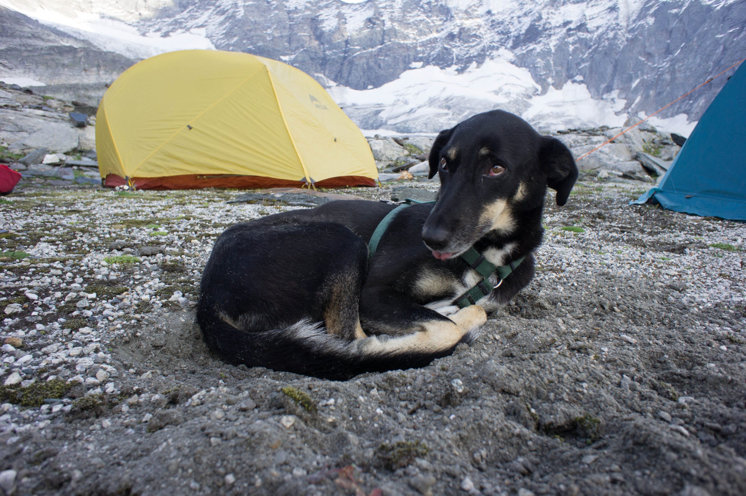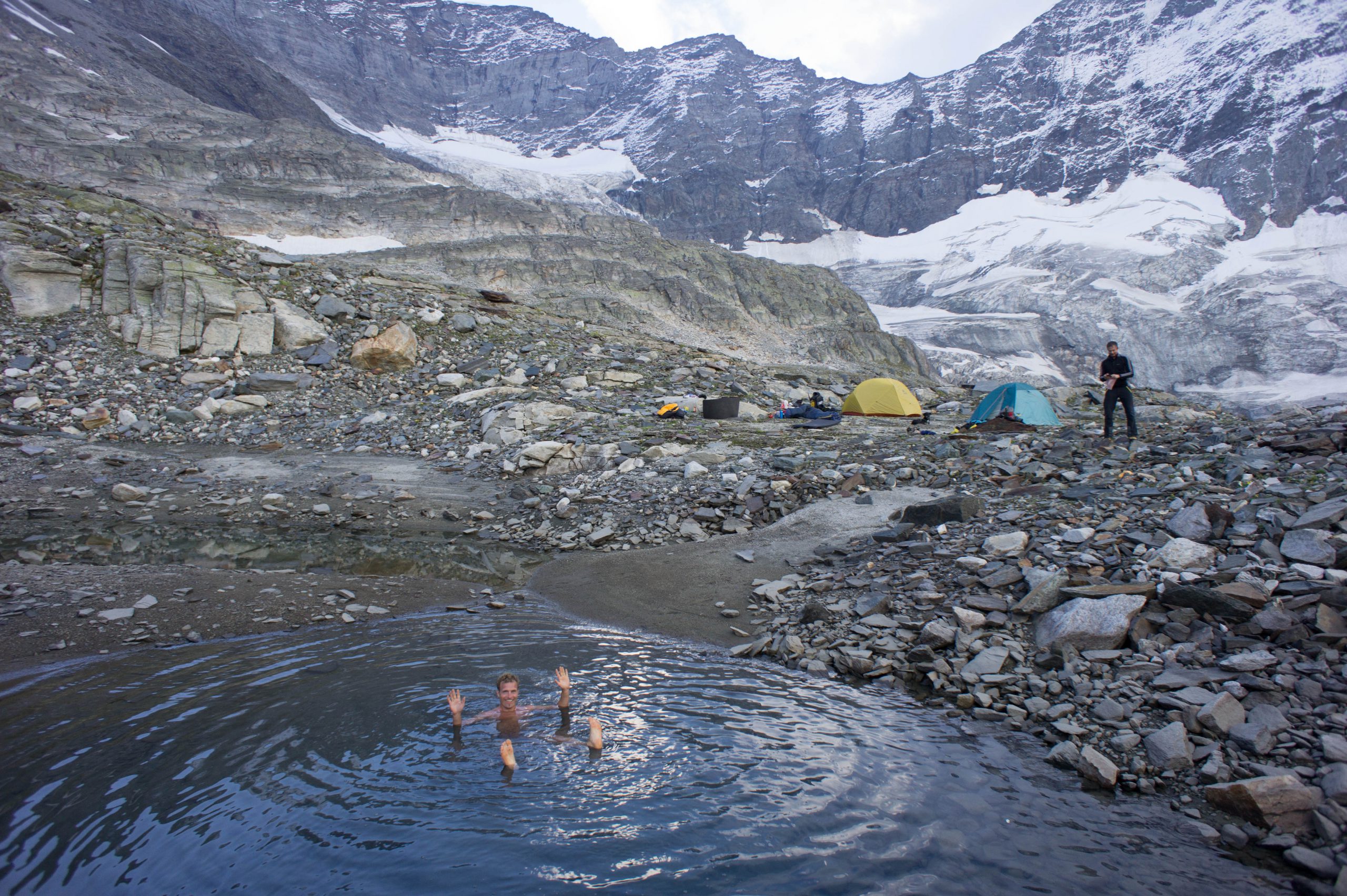 Felix ist wie Ronja ein echt harter Hund und legt sich noch zu einem abendlichen Bad in den eiskalten Tümpel. Sackerl Zement! Anschließend sind schnell die Zelte aufgebaut und ein warmes Essen brodelt auf dem Kocher.