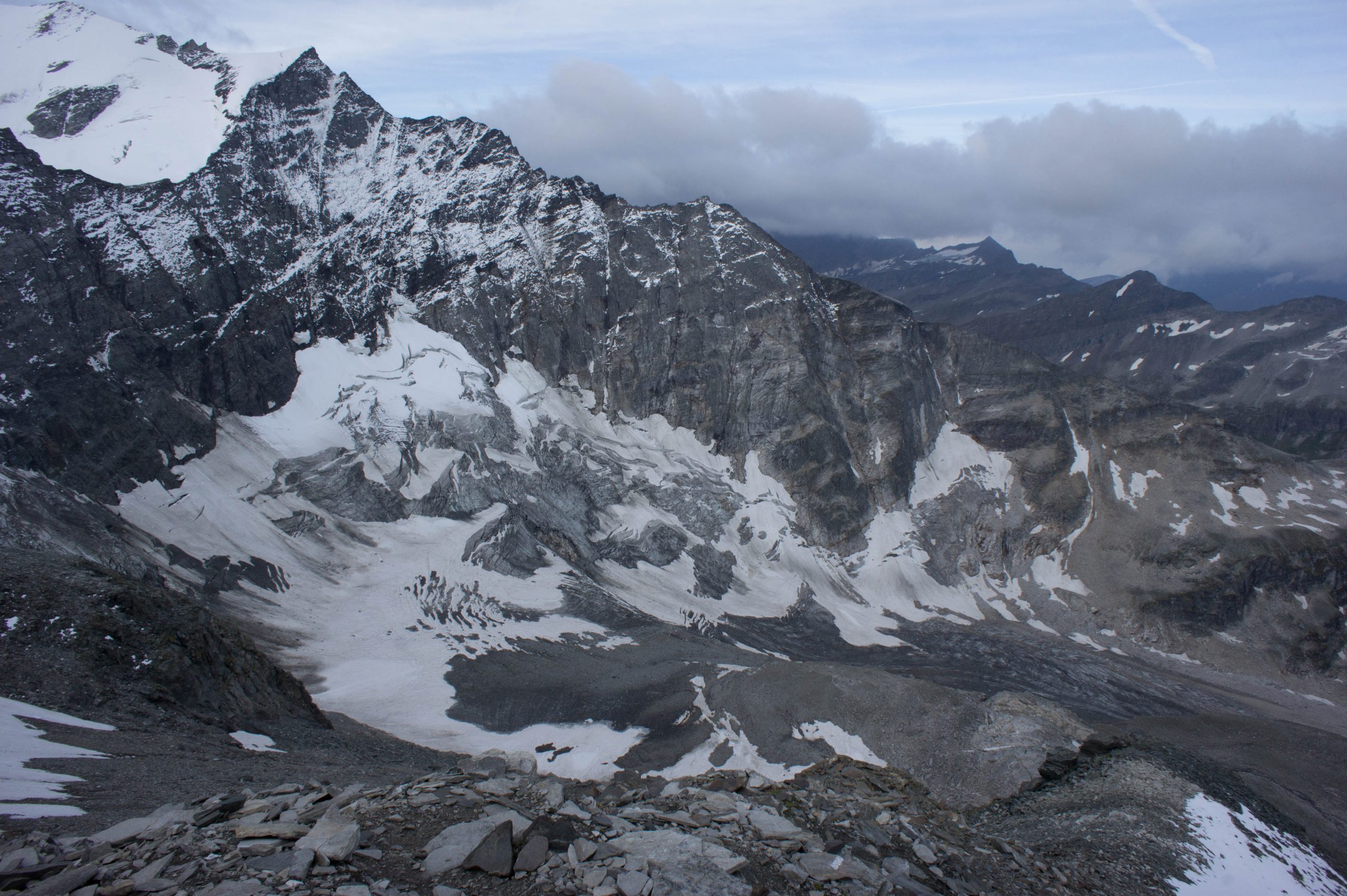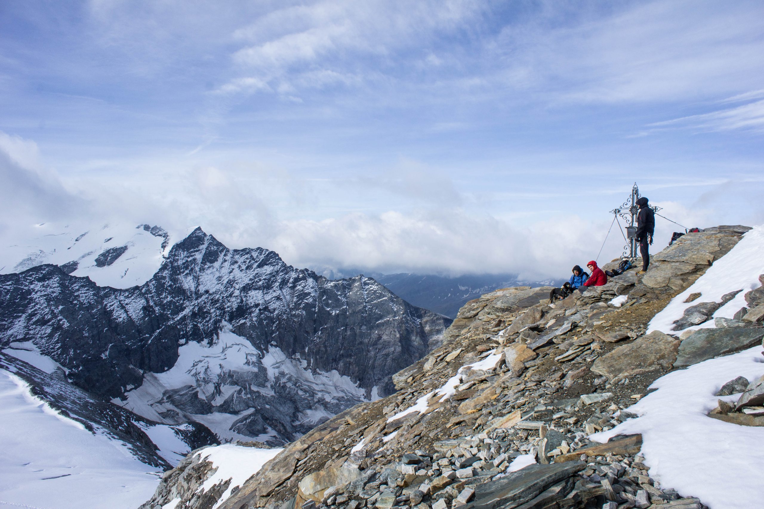 Der Sturm fegt nun richtig heftig von Westen her und wir entscheiden uns schnell, nur die Hohe Riffl zu besteigen und den etwas anspruchsvolleren Nordwestgrat des Johannisbergs rechts liegen zu lassen. Kurz betreten wir den obersten Rand der Pasterze, seilen sicherheitshalber an und kraxeln dann den einfachen Gipfelaufbau der Hohen Riffl bis zum höchsten Punkt. Die Aussicht ist beeindruckend, wenn auch der König der Hohen Tauern, der Großglockner, hin und wieder in den Wolken verschwindet. Zwei Tschechen kommen von der Oberwalderhütte aus am Gipfel an, wir ratschen kurz.