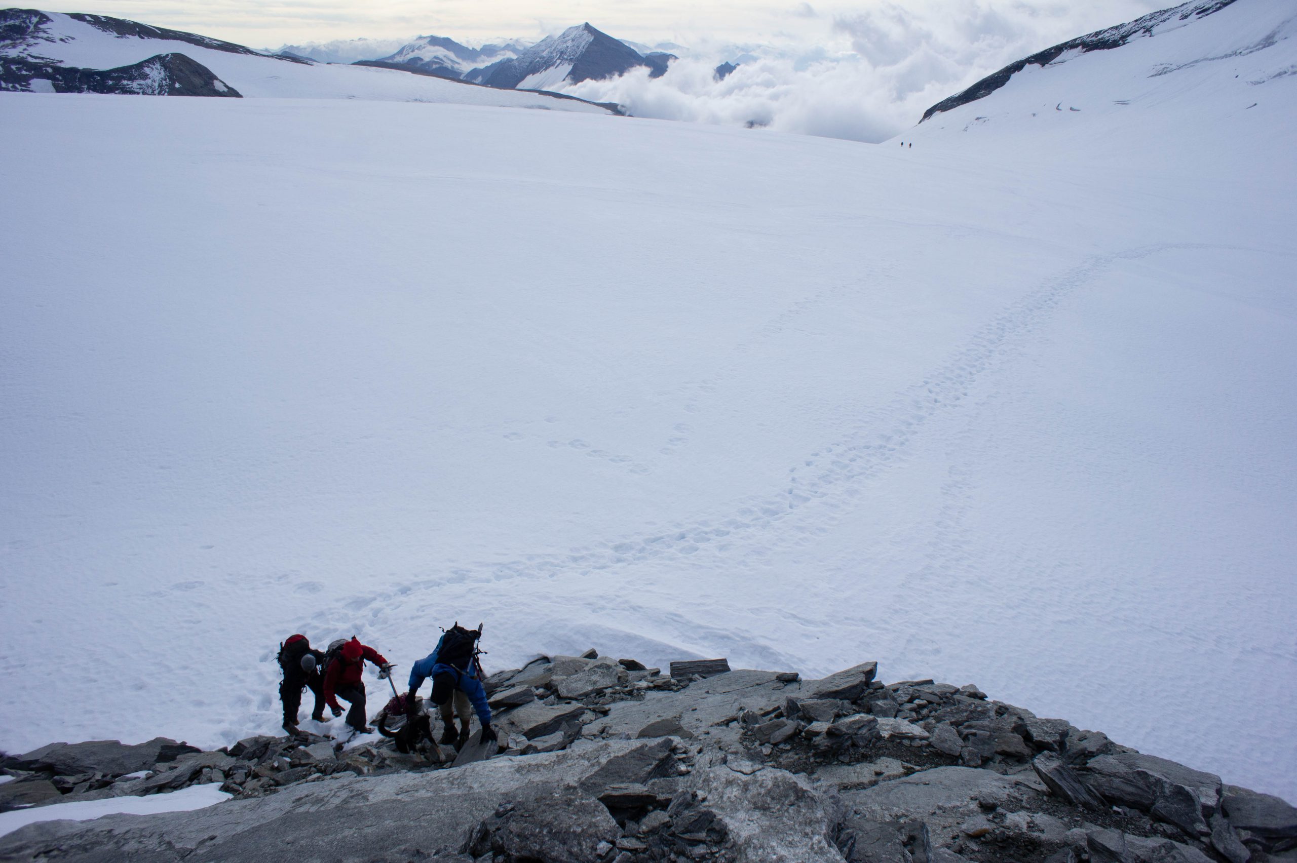 Der Weg schlängelt sich steil und abwechslungsreich durch sandig-gerölliges Gelände, nimmt eine Steilstufe hier und eine Reiße dort mit und mündet schließlich in die 3228 Meter hoch gelegene Scharte. Beeindruckend – wir stehen hier am obersten Ende der Pasterze und direkt gegenüber liegt die Oberwalderhütte, von der schon einige Seilschaften gestartet sind.