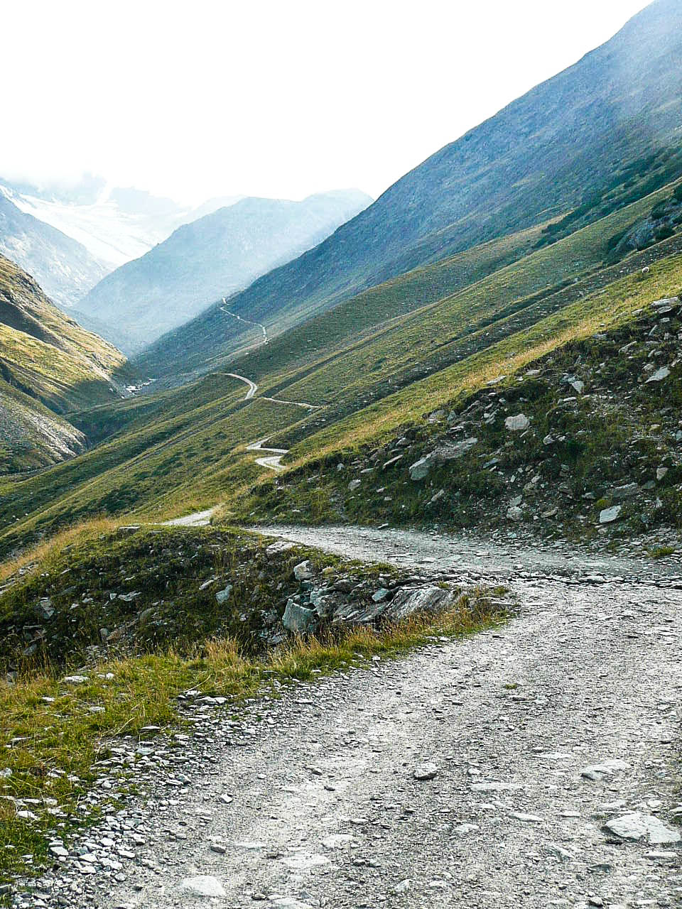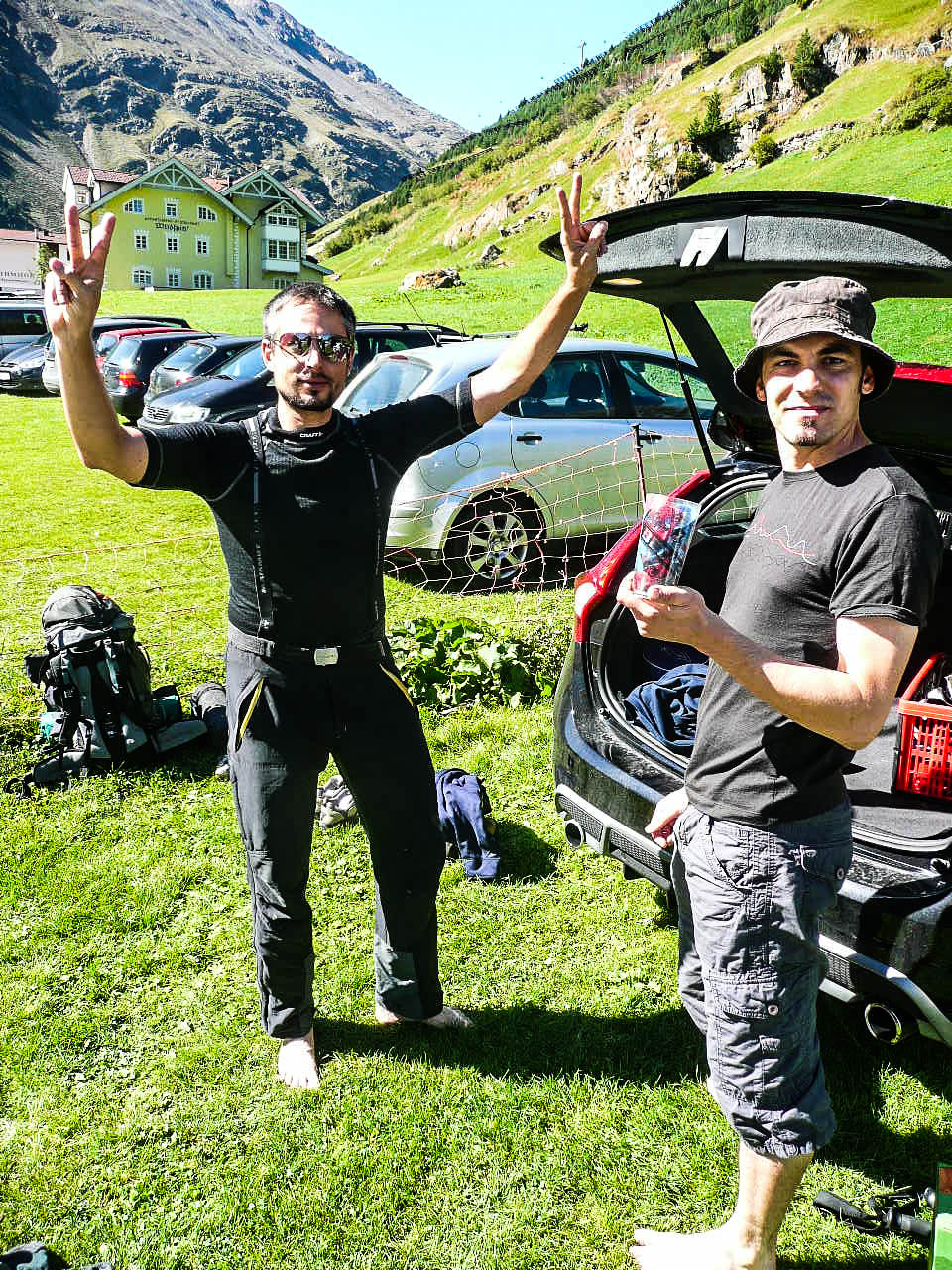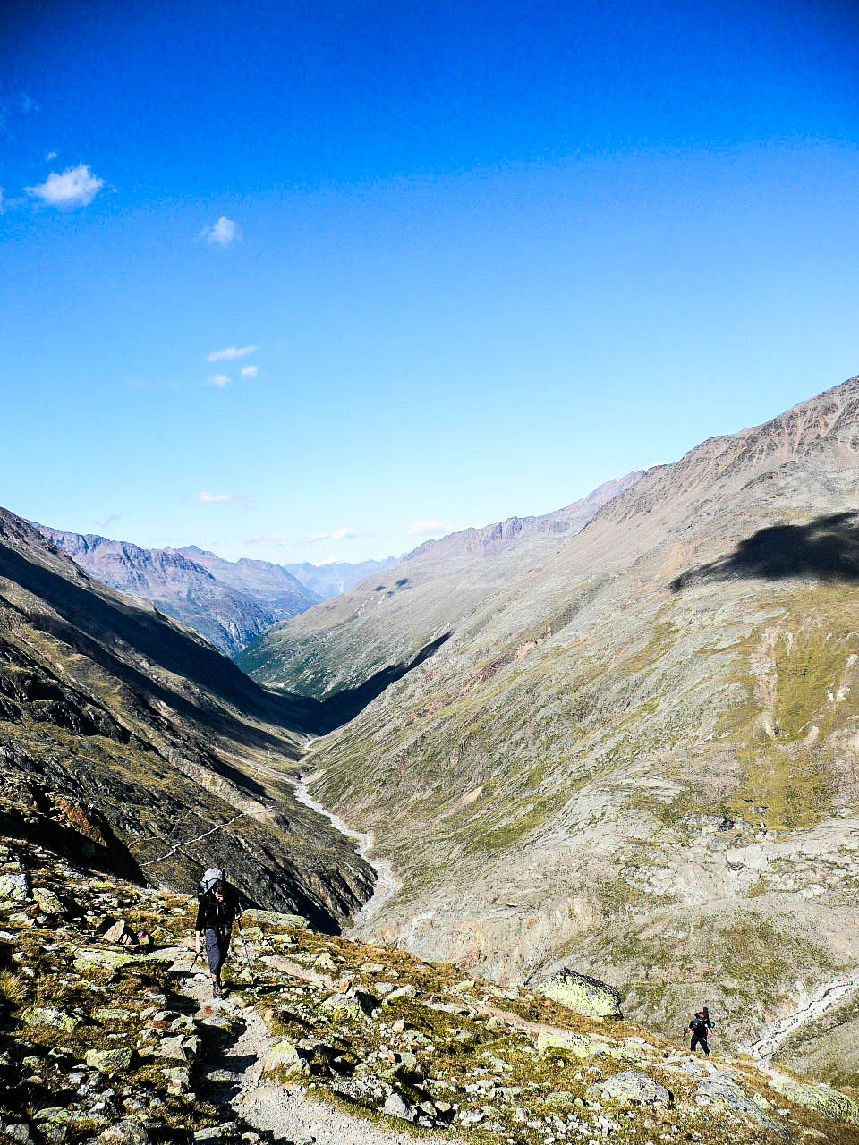 Der Gegenanstieg zum Biwakplatz saugt uns nochmal ein paar Körnerchen aus den Haxn, nach dem Packen stapfen wir ordentlich beladen wieder hinab zur Martin-Busch-Hütte. Hier gibt es eine ordentliche Stärkung in Form von Apfelstrudel und ähnlichen Köstlichkeiten. Zum Glück haben wir nun nur noch den Fahrweg hinab nach Vent vor uns, den es sich hervorragend hinabschlendern lässt. Viel zu schnell ist die Hintere Schwärze schon wieder Vergangenheit. Ein Berg, der vollsten Respekt verdient hat – auch wenn die Spaltenlage auf dem Gletscher bei weitem nicht so schlimm war, wie wir befürchtet hatten.