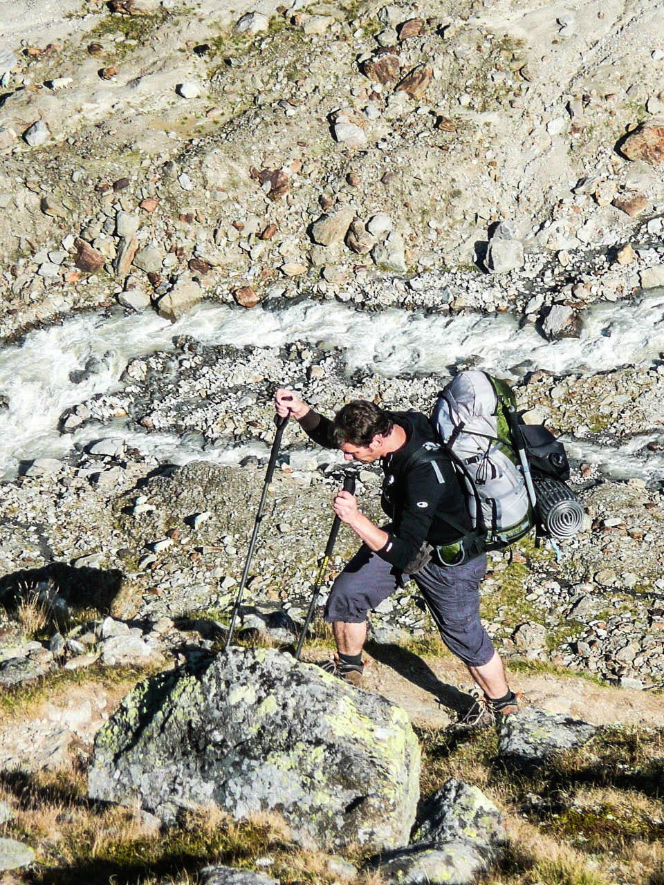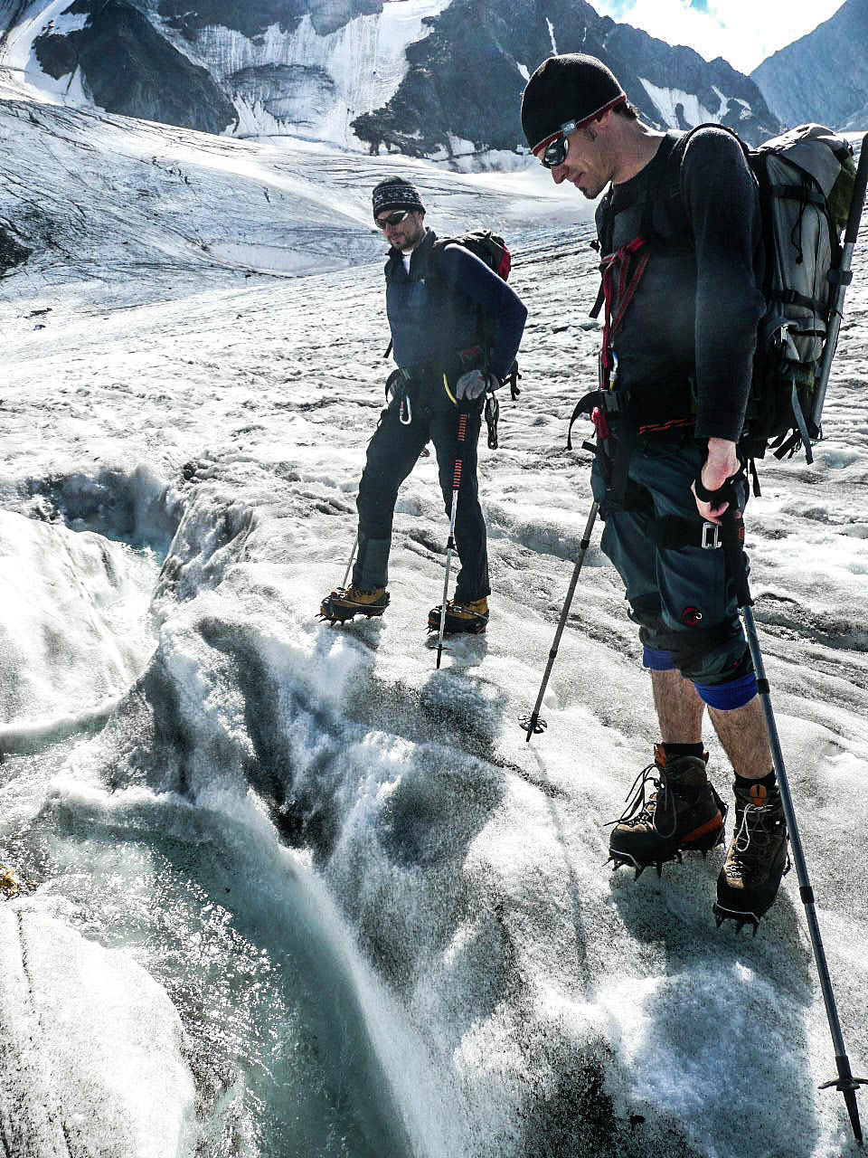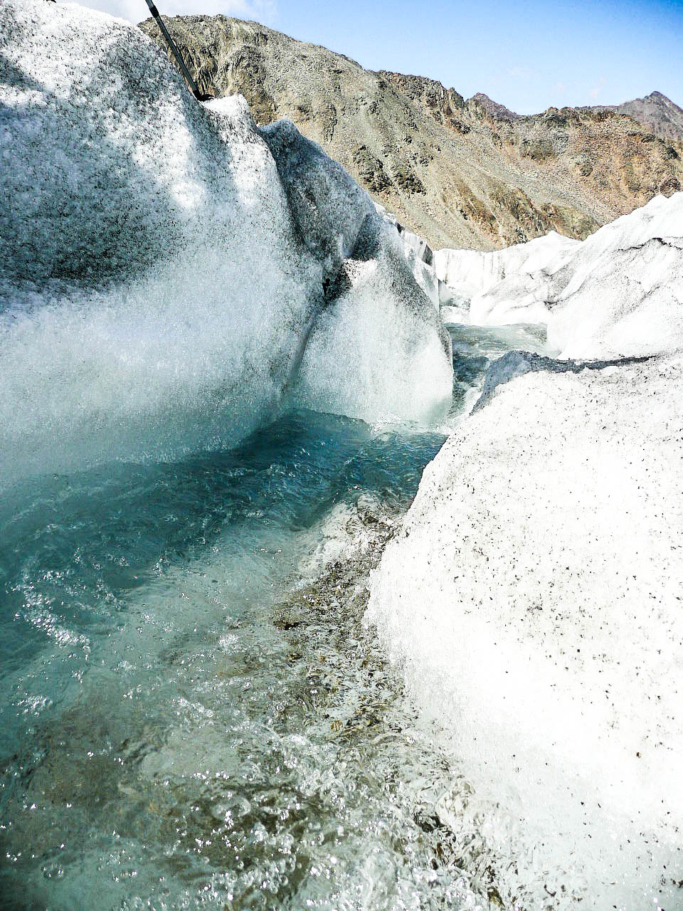 Nach einer ausgiebigen Pause zieht es uns wieder in die Tiefe – schließlich haben wir noch ein ganzes Stückchen Heimfahrt vor uns. Der schwierige Abschnitt oberhalb des Gratrückens will mit Bedacht begangen werden, zum Glück rutscht keiner auch nur einen Meter aus. Weiter unten wird es schließlich richtig warm. Unglaublich, wie sehr der Gletscher hier auch Anfang September noch Wasser lassen muss. Klimaerwärmung live ist das hier…bei strahlendem Wetter.