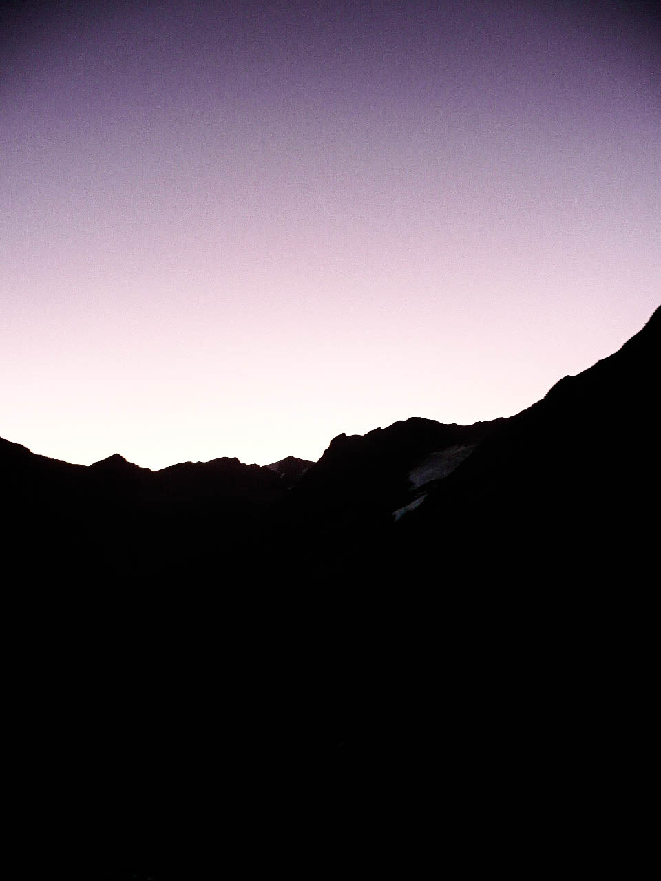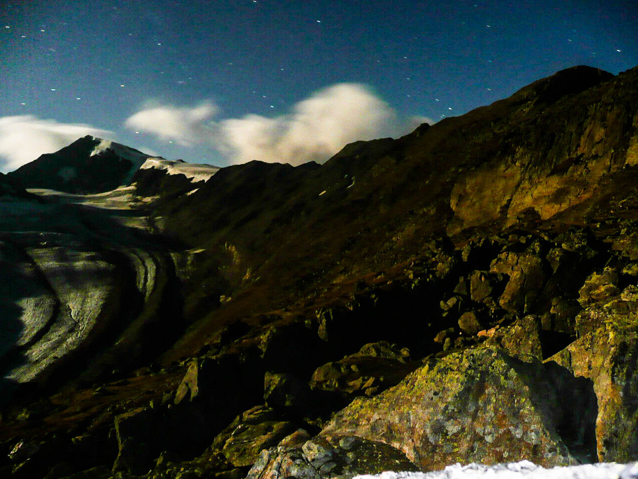 Bei der Abzweigung des Wegs zum Marzellferner vom Hauptweg Richtung Similaun finden wir ideales, flaches Biwakgelände. Bald haben wir uns eine ebene Fläche zwischen einigen großen Felsbrocken für Iso und Schlafsack präpariert. Nachdem wir uns an der Aussicht satt gesehen haben, kochen wir uns ein umfangreiches Abendmahl, machen noch einige Bilder des aufgehenden Mondes und legen uns dann schlafen. Die Nacht ist sternenklar und windstill.