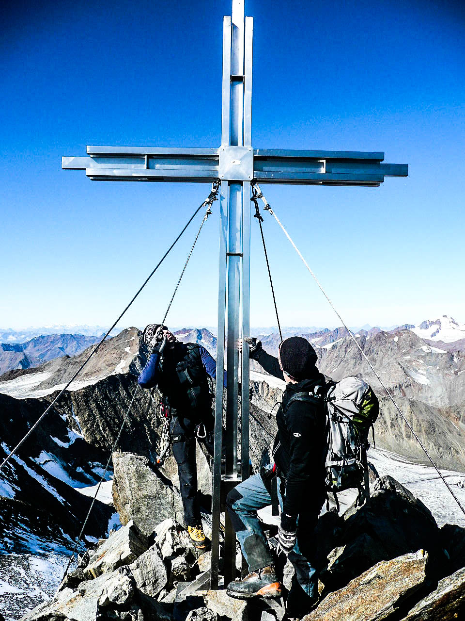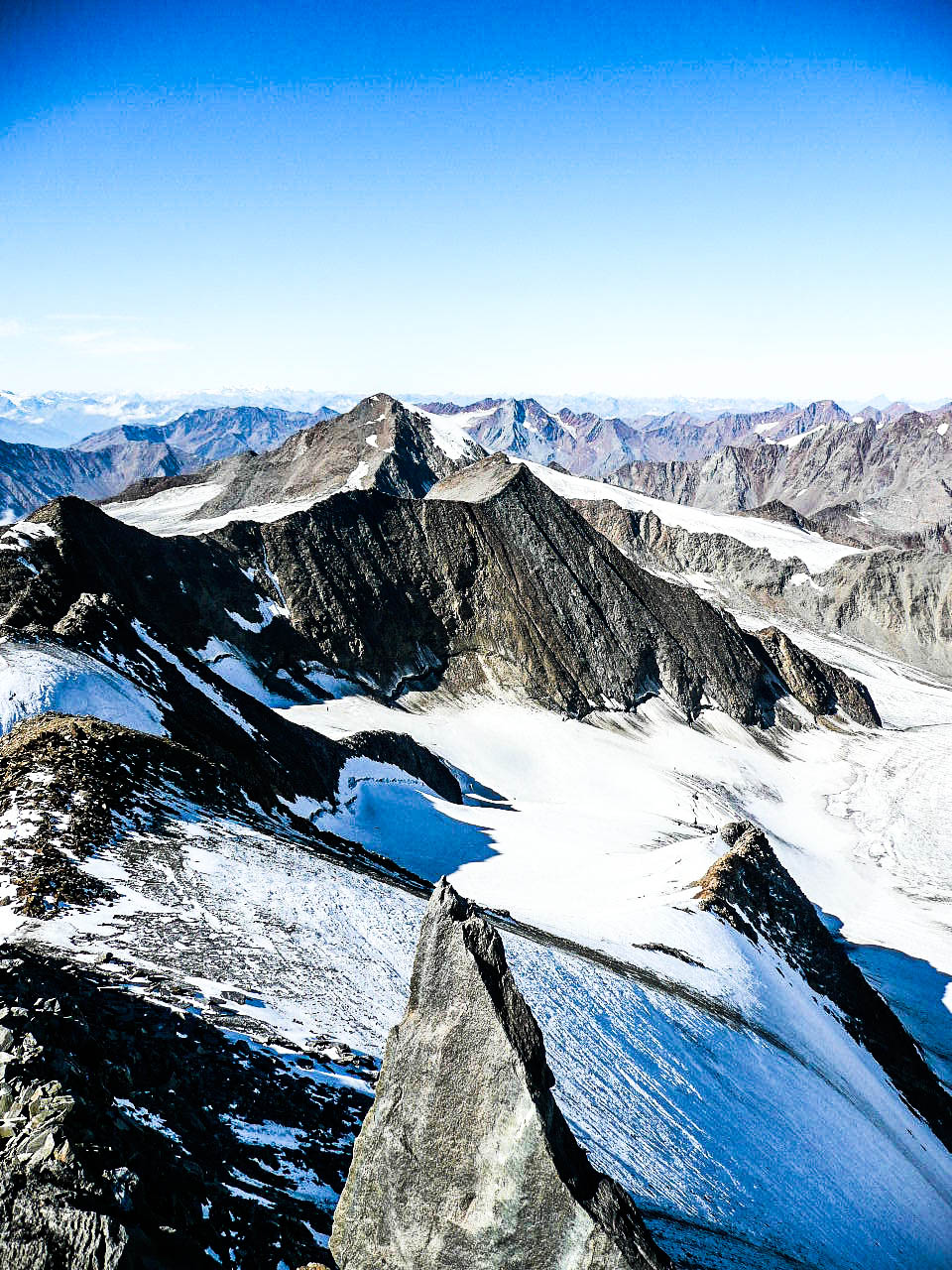 Nun kommt der für mich beeindruckendste Schlüsselteil der Tour, denn unser bis jetzt recht zahmer Gratrücken verwandelt sich in einen ausapernden Steilhang. Lockeres Geröll liegt auf steilem Eis und Firn und wir müssen zusehen, dass wir die Schritte mit Bedacht setzen. Ein Ausrutscher würde eine recht umfangreiche Rutschpartie nach sich ziehen. Zum Glück erreichen wir bald sicheren Fels und kraxeln die letzten Meter hinauf zum fast ebenen letzten Gratabschnitt vor dem spitzen Gipfel. Einige Minuten später stehen wir oben, auf der Hinteren Schwärze. Ganz alleine, bei Kaiserwetter. Alle hohen Ötztaler gruppieren sich um uns herum, auch die Texelgruppe und die Dolomiten sind schön zu sehen.