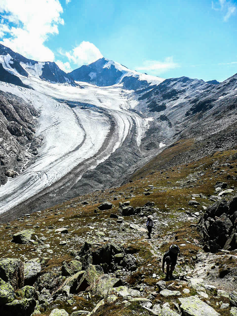 Am nächsten Morgen hält es uns nicht besonders lange im Schlafsack – ein strahlender Tag beginnt! Nach Kaffee und Kuchen zum Frühstück geht es erst einmal hinab Richtung Marzellferner. Man merkt, wie instabil die unteren Hänge des Marzellkammes durch das Zurückweichen des Ferners werden. Weiter unten zeigen sich überall kleine Risse und Hangrutsche, richtig geheuer ist einem das Gelände nicht. Weit, immer weiter geht es hinunter, ehe wir auf unter 2700 Meter endlich den völlig mit Schutt beladenen Gletscher betreten.
