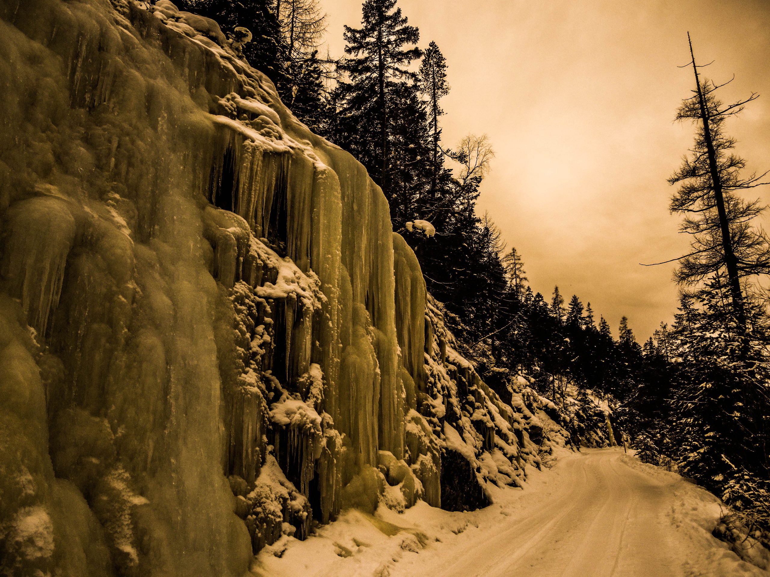 Eigentlich war der Große Solstein mit Schneeschuhen zum Sonnenuntergang geplant. Daher später Aufbruch vom Zug in Mittenwald um 11:22 Uhr. Durch den Riedboden nach Scharnitz traumhaft festgepresster Schnee, schön zu fahren. In Scharnitz Kaminwurzen und Vinschgerl gebunkert, dann ab in die Einsamkeit der Karwendeltäler. Alle Fahrwege schön eingespurt, hie und da leicht eisig. Die Isarbrücke Richtung Gleirschtal liegt einsam da, beeindruckende Eisskulpturen hinauf zur Amtssäge. Mit dem Rad bis auf ca. 1200 Meter gefahren, dann wurde es zu sulzig, Inversionswetterlage macht sich bemerkbar…