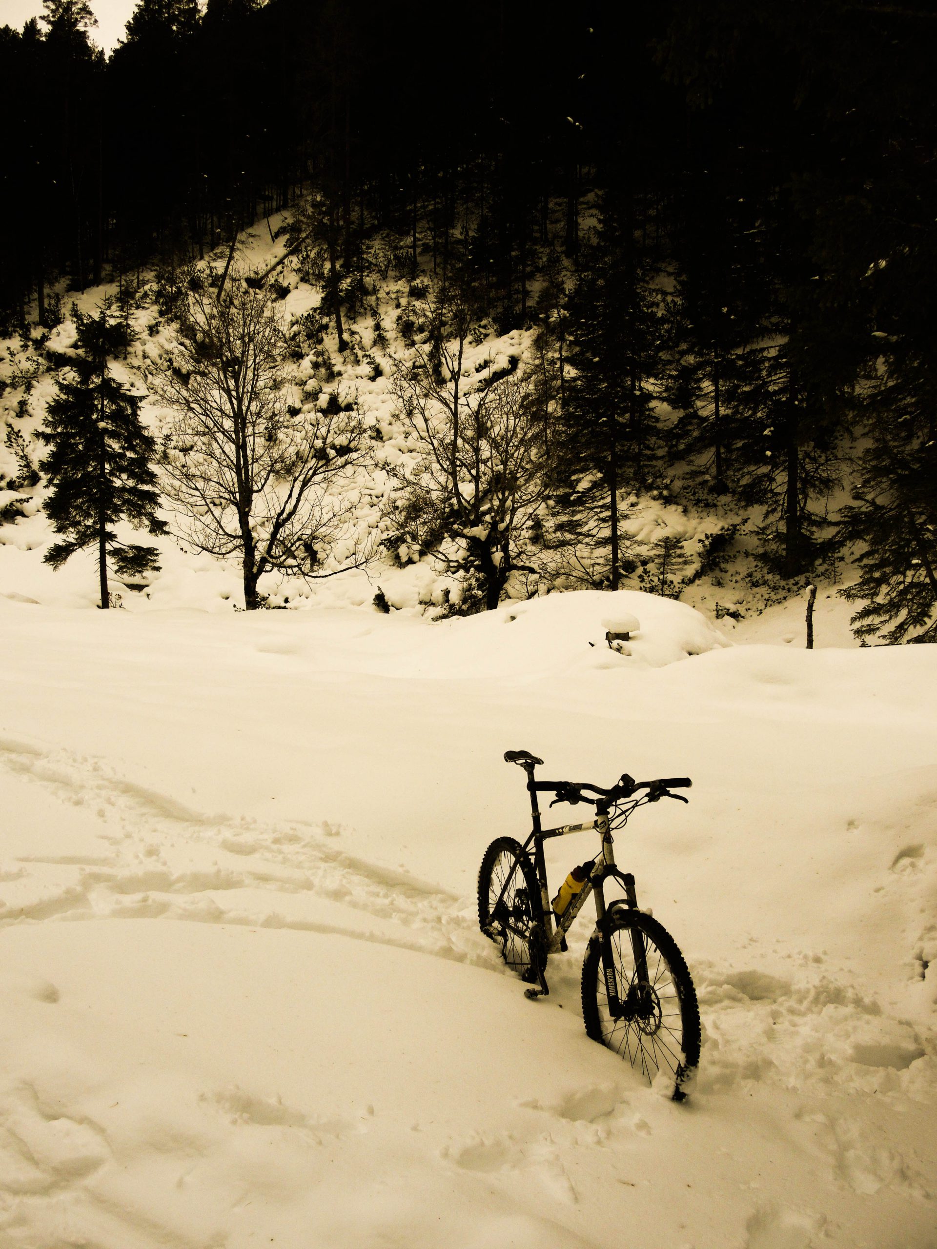 Das Gleirschtal ist eines der einsameren Karwendeltäler, erst recht im Winter. Das Zugangstal zur Pfeishütte und zum Solsteinhaus mit dem MTB kurz vor Weihnachten beradeln – bei der derzeitigen Schneelage kein Problem.