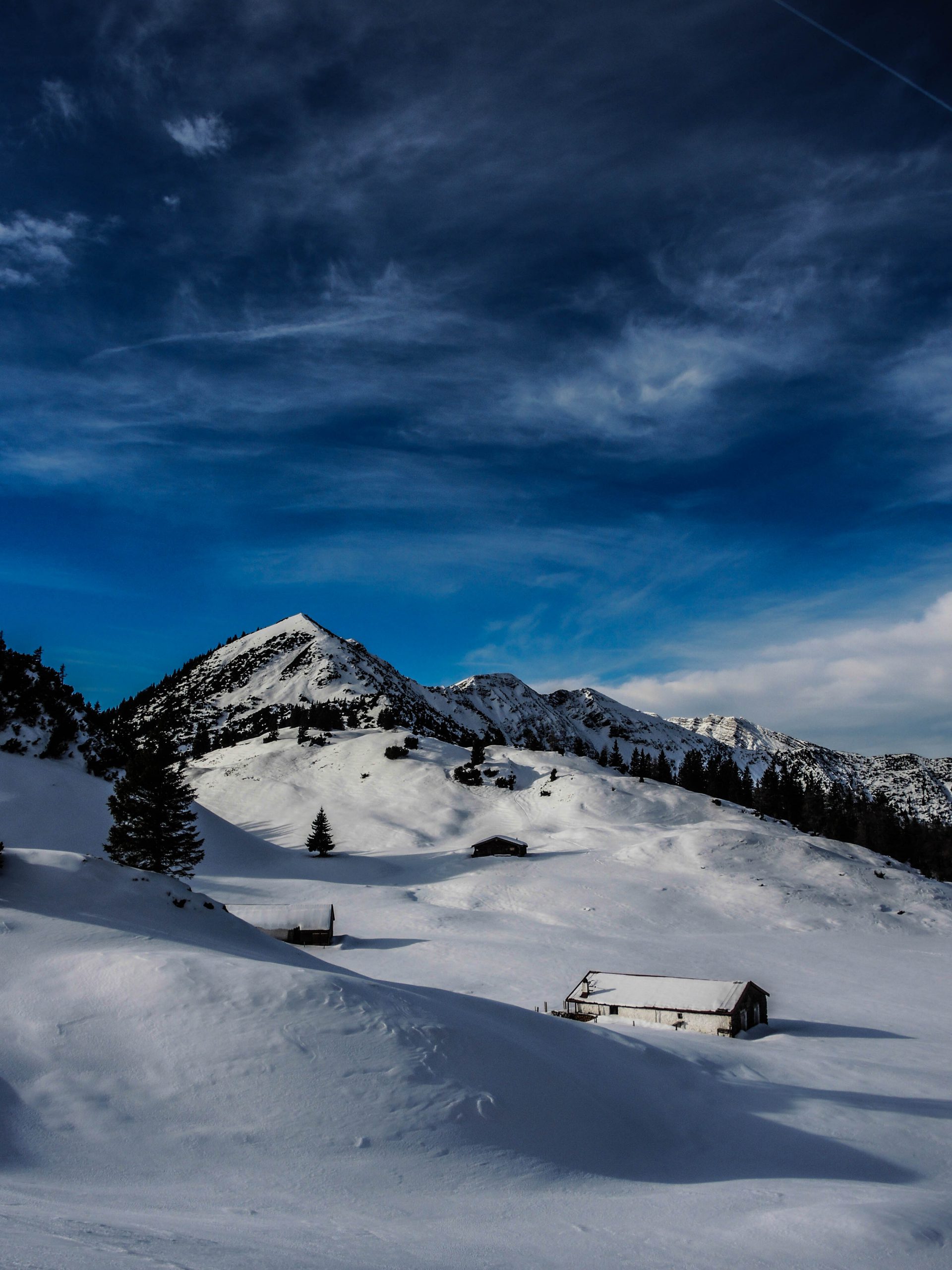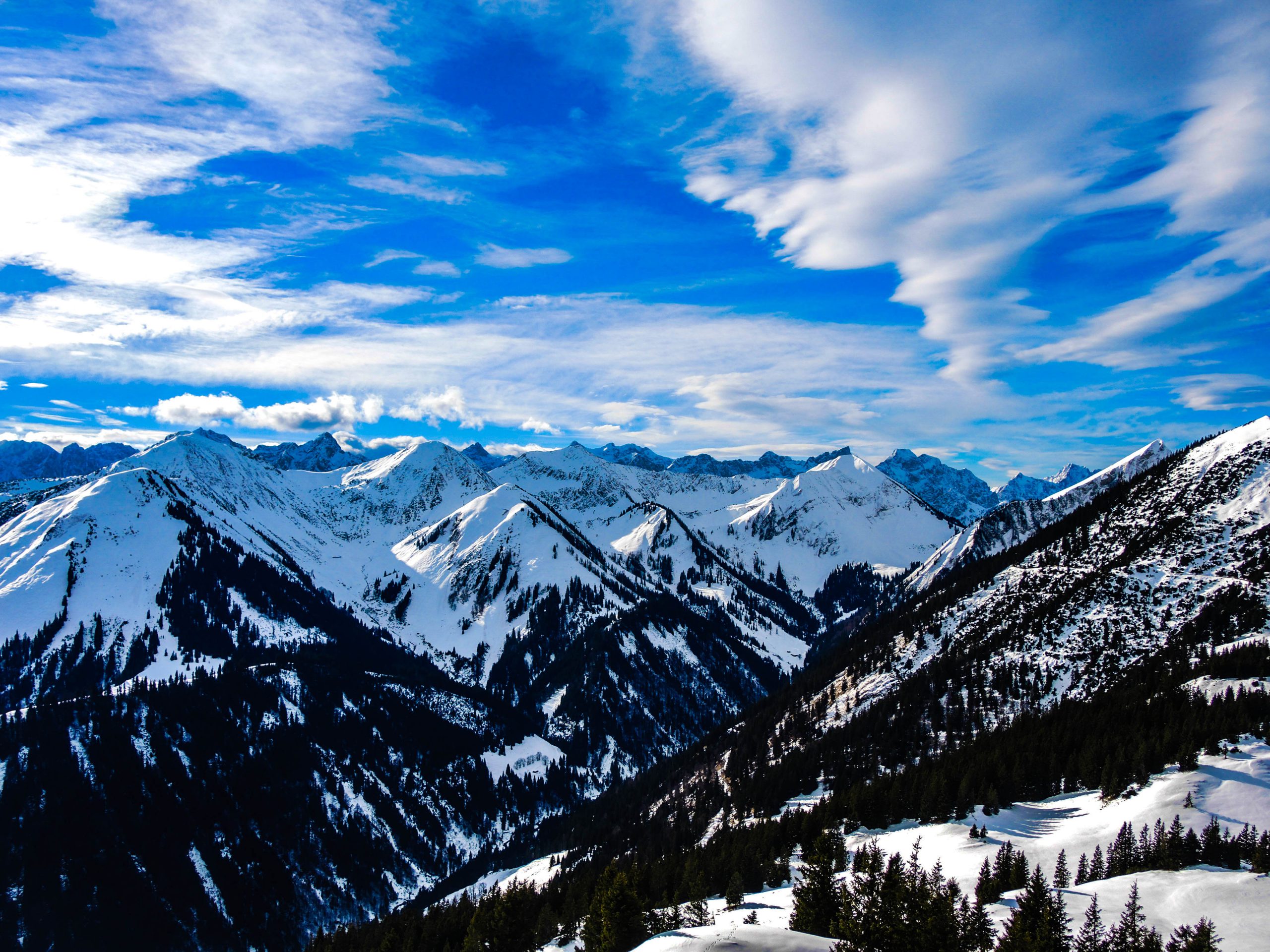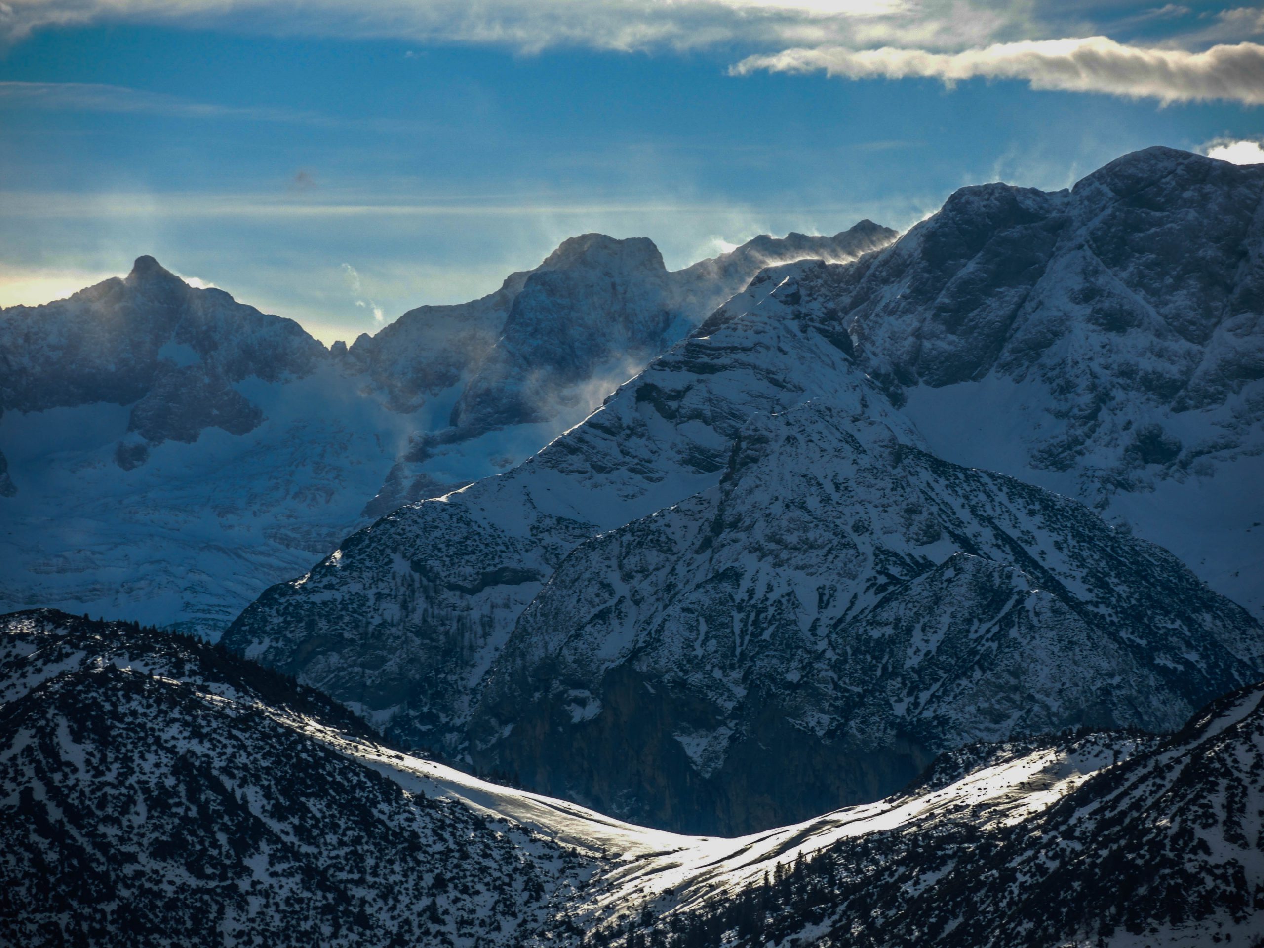 Die Karwendel-Gipfelschau ist, ohne zu übertreiben, auch für Karwendel-Kenner atemberaubend – was am einsetzenden Föhnsturm liegt, der die Luft ordentlich durchputzt. Die Karwendelkämme liegen in all ihrer Pracht zum Greifen nah aufgefächert da. Der Wind weht Schneefahnen von den Gipfeln, die gerade-so-Zweitausender Fleischbank, Hölzelstaljoch und Grasberg sehen heute fast wie mächtige Hauptkamm-Dreitausender aus, wenn da die hohe Waldgrenze nicht wäre. Nur schwer können wir uns von der Aussicht trennen.