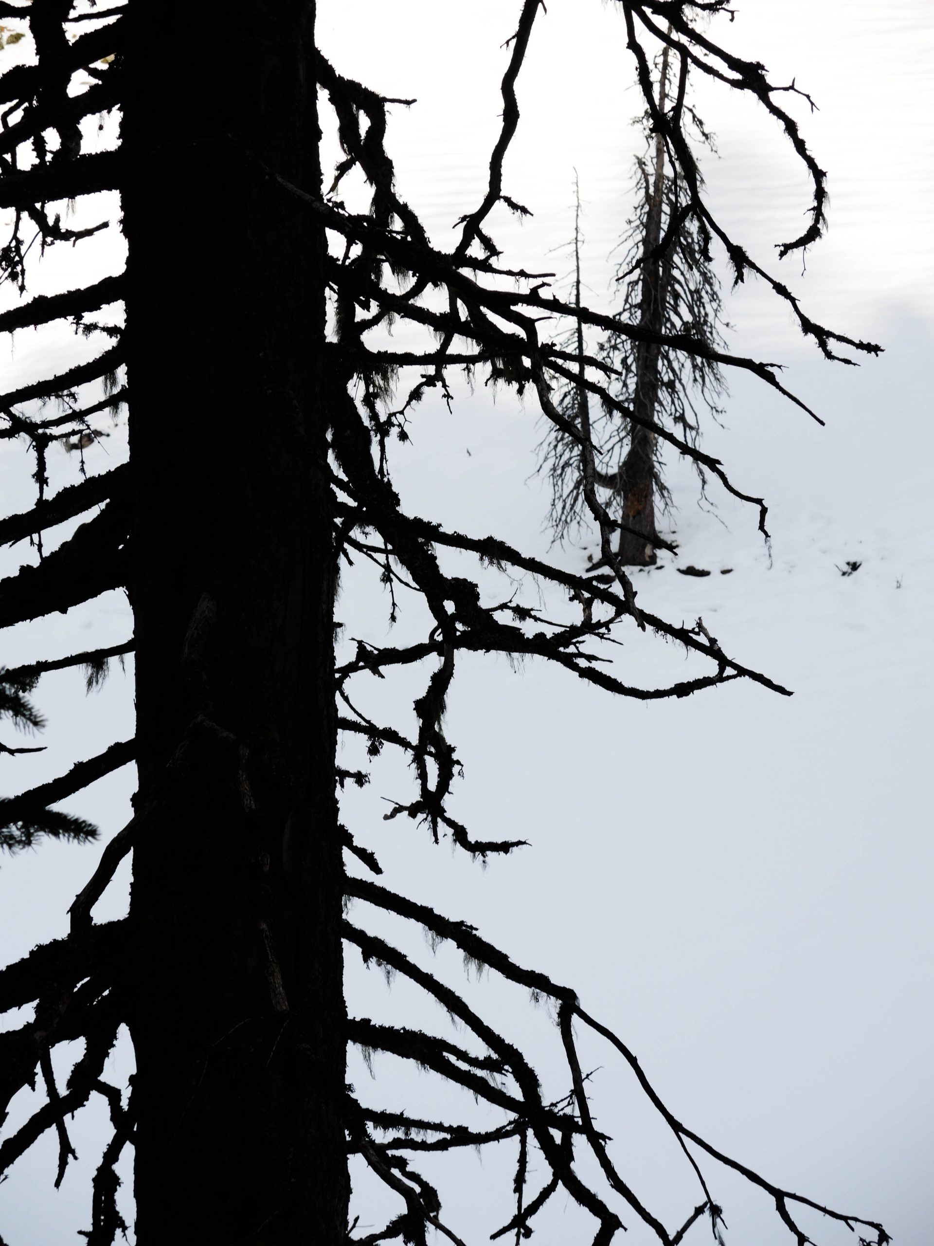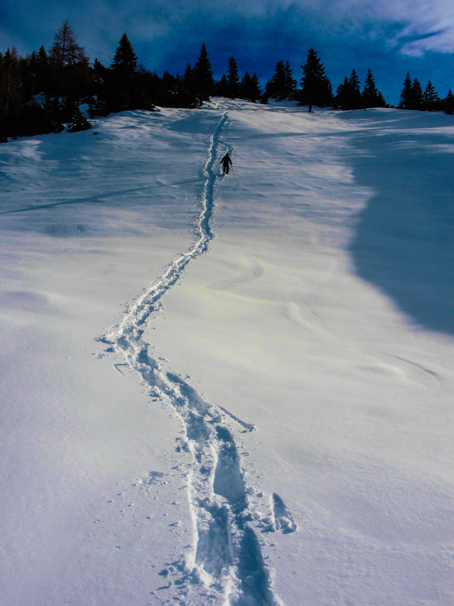 Einsam ist es hier hinten, einige wenige Skispuren auf dem Weg über die Dürrach zeugen von geringer Frequentierung. Es lohnt es sich heute nicht, die Ski überhaupt dabei zu haben. Die Schneeauflage ist auch hier hinten im schattigen Tal extrem dünn, Steine und Baumstümpfe schauen überall heraus, von der Qualität des Schnees ganz zu schweigen. Diese changiert zwischen bockhart gefroren und breiig und feucht. Wir nehmen den Fußweg hinauf Richtung Almen, die Abschnitte durch den Wald sind sogar komplett schneefrei. Erst auf 1300m Höhe legen wir die Schneeschuhe an und stapfen hinauf zum Lerchkogel-Niederleger, wo wir in der Sonne kurz pausieren. Es stellt sich ein Wärme-Feeling ein wie bei der Venter Runde im Spätapril. Die Demeljoch-Südflanke ist bis etwa 1700 Meter hinauf komplett aper. Absurd, aber wahr. Nirgendwo sonst als in den Bergen wird es ähnlich deutlich, wie sich die Klimaerwärmung auswirkt.