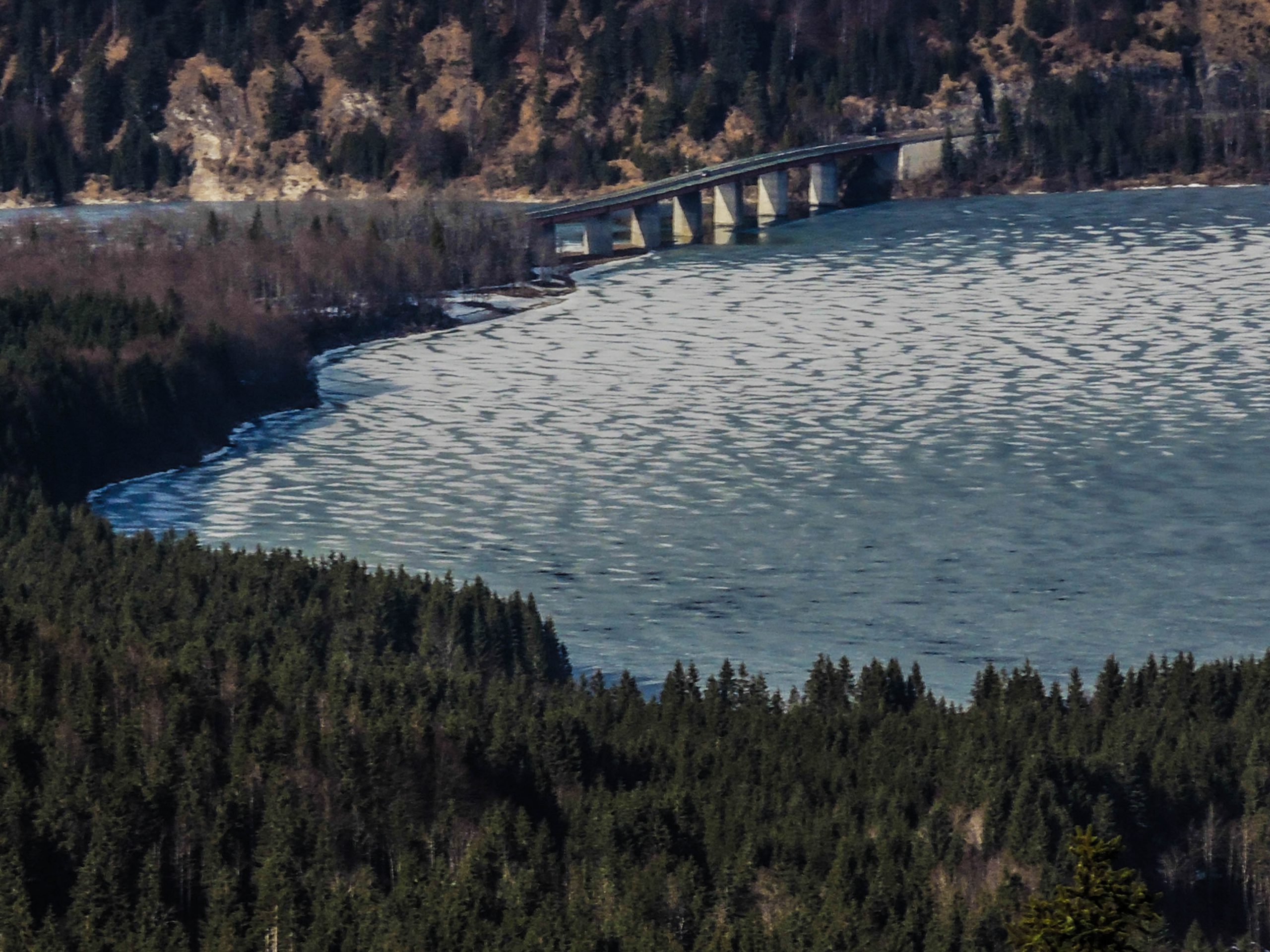 Der Weg zurück Richtung Sylvenstein zieht sich, wenigstens ist die Straße nicht mehr so a****glatt. Immerhin haben wir am Ende rund 16 Kilometer und 1000 Höhenmeter in den Beinen. Und jede Menge Erinnerungen an ein notorisch unterschätztes Eck des Vorkarwendels, das uns mit seiner Abgelegenheit heute auch ein wenig verzaubert hat.