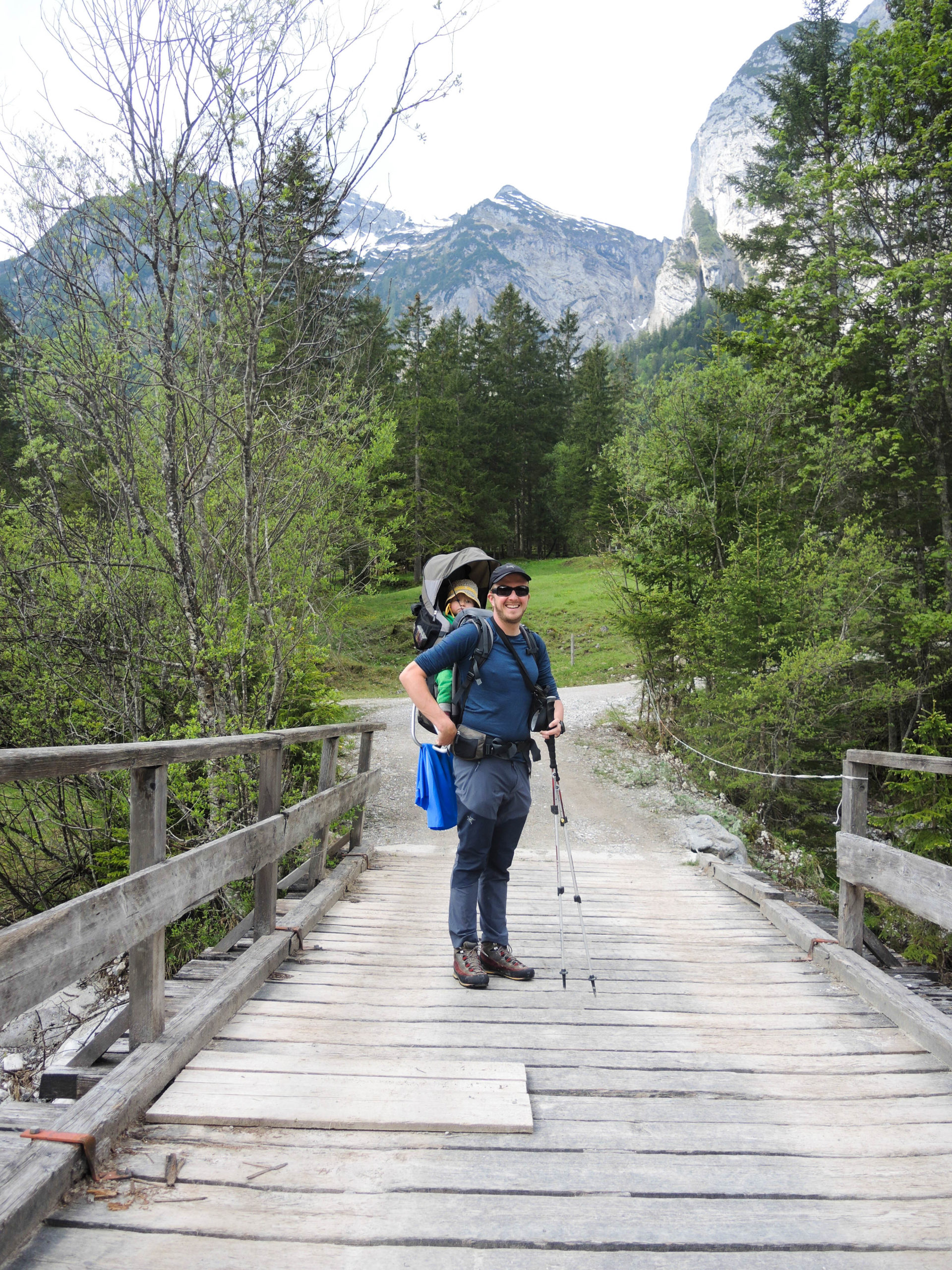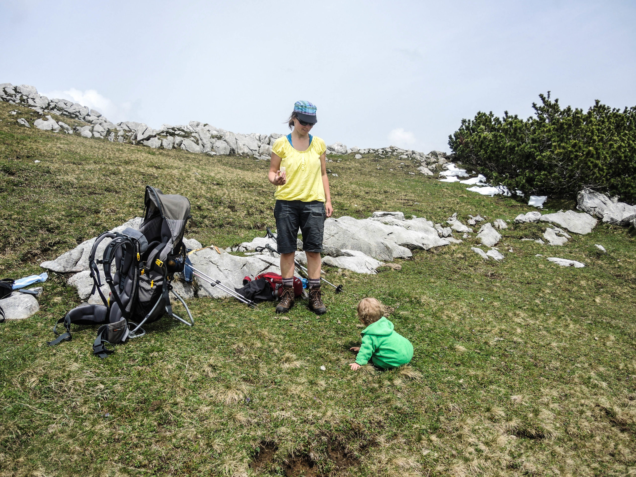 Wir lassen jedoch unsere Kleine auf den schönen flachen Gipfelwiesen herumkrabbeln, nehmen einen Snack ein und machen uns dann auf den gemütlichen Abstieg über den Wiesenrücken nach Nordwesten. An der Einsattelung vor dem Kompar (der ab hier in ca. 20 min erreichbar ist) geht es schließlich Kehre auf Kehre hinab zur Hasentalalm. Der Weg ist bis auf den oberen Teil, der etwas ausgewaschen ist, auch mit Kraxe schön zu gehen und erlaubt immer wieder traumhafte Blicke zum großen Ahornboden und Umrahmung. Nach dem Niederleger wird der gumpenreiche Hasentalbach durchfurtet – der perfekte Badeort, sollte man denn die entsprechende Ausrüstung dabei haben oder sich trauen, nackert hineinzuhupfen.