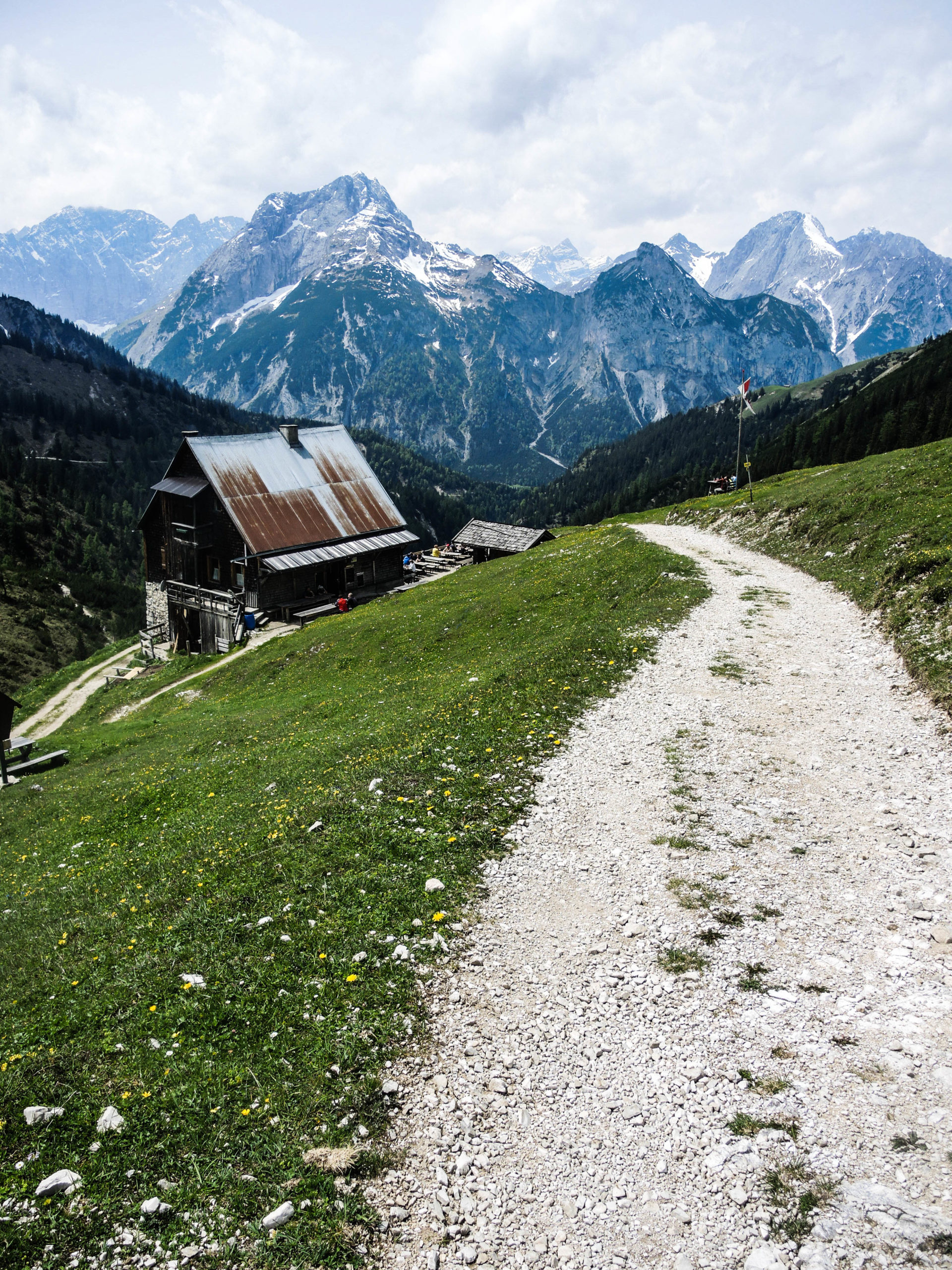 Schließlich zweigt ein wunderschöner Steig links in die Latschen ab, und man verlässt die Fahrstraße wieder. Kleine Bachtälchen werden gequert, die Ende Mai noch reichlich Wasser führen. An einem besonders idyllischen Zusammenfluss zweier kleiner Bäche entsteht fast schon “Oasen-Feeling”! Nach rund zwei Stunden ab Hagelhütten geht es schließlich die finalen Höhenmeter zur Plumsjochhütte hinauf, die zur Einkehr einlädt. Uriger geht’s im Karwendel kaum, und es bleibt zu hoffen, dass die Hütte noch lange ihren ursprünglichen Charme behält! Allein das Plum(p)sklo ist inzwischen kein echtes Plumpsklo mehr, was authentisch veranlagte Bergsteiger vielleicht ein wenig enttäuscht….