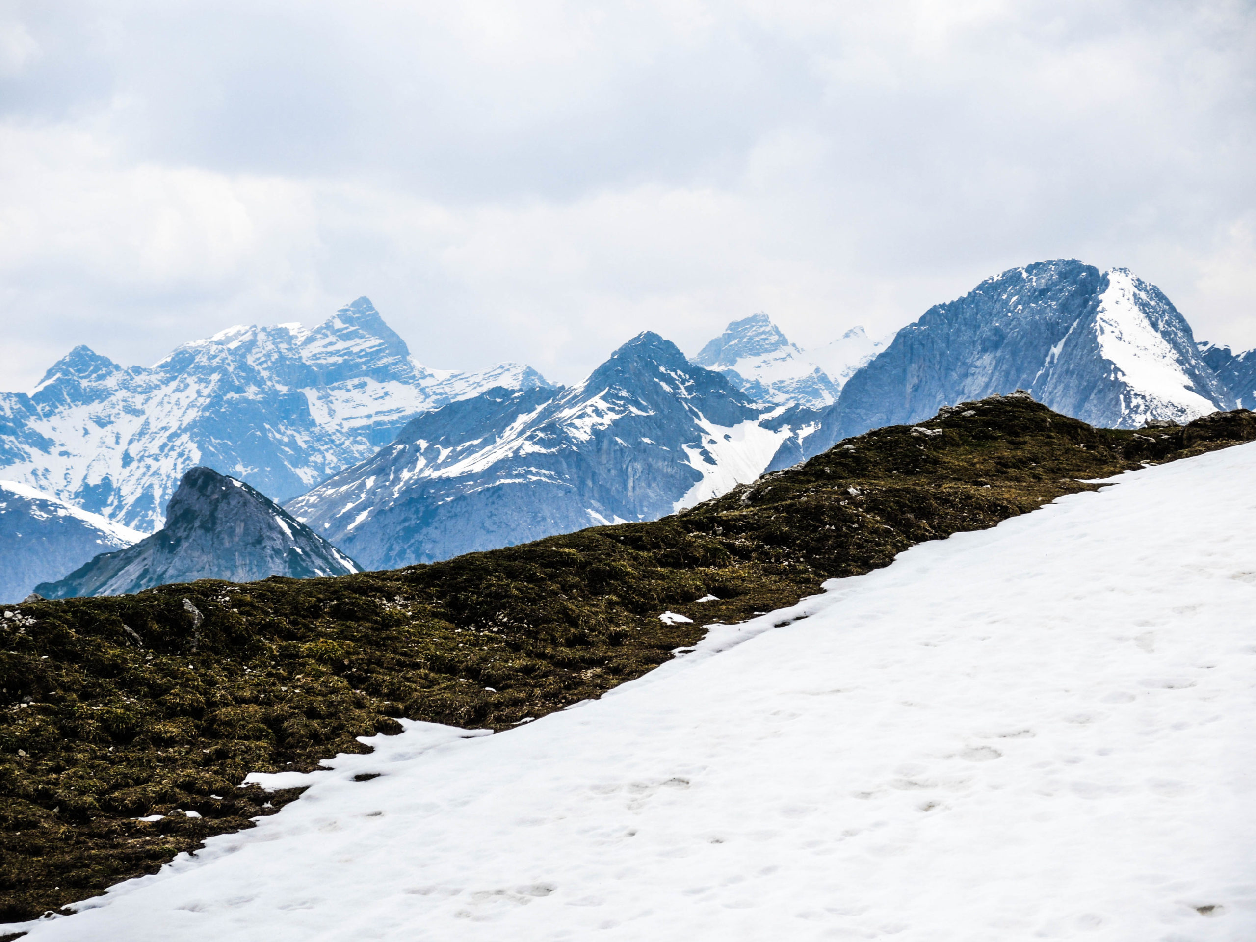 Das Panorama belohnt für den schweißtreibenden Anstieg: Demeljoch, Montscheinspitze, Rofan, Falzthurnjoch, Bettlerkarspitze, Sonnjoch, Hochglück, Kaltwasserkarspitze, Birkkarspitze, Östliche Ödkarspitze…..alle sichtbaren Gipfel aufzuzählen, wäre müßig. Gleich nebenan grinst der Kompar herüber (den besonders Eifrige auch noch schnell abhaken können), mit seinen 2015 Metern ein waschechter Zweitausender.