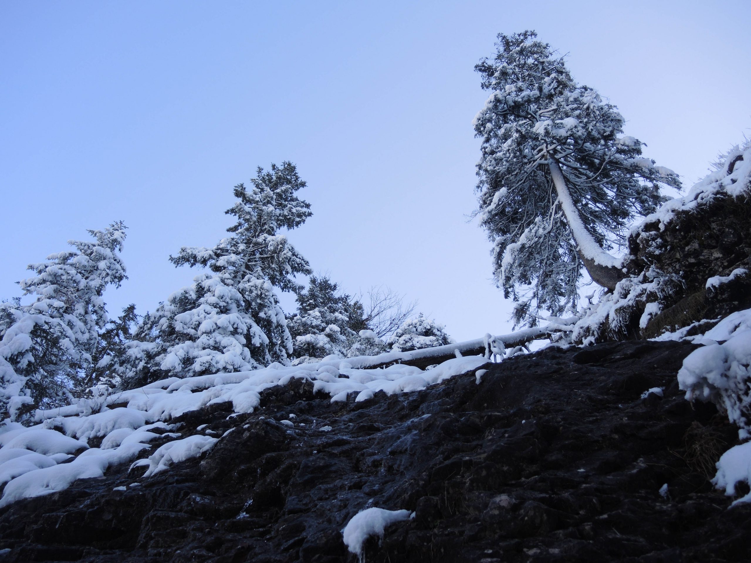 Nach dem Schürpfeneck senkt sich der Weg kurz zu einem Sattel, folgt dem Bergrücken nach Süden und wendet sich dann kurz nach Westen ins Latschendickicht. Ich nehme die Abkürzung und folge einer kurzen Reißn steil hinauf durch etwa 50cm tiefen Neuschnee. Schneeschuhe habe ich keine dabei, und so wird es direkt ein bisserl anstrengend!