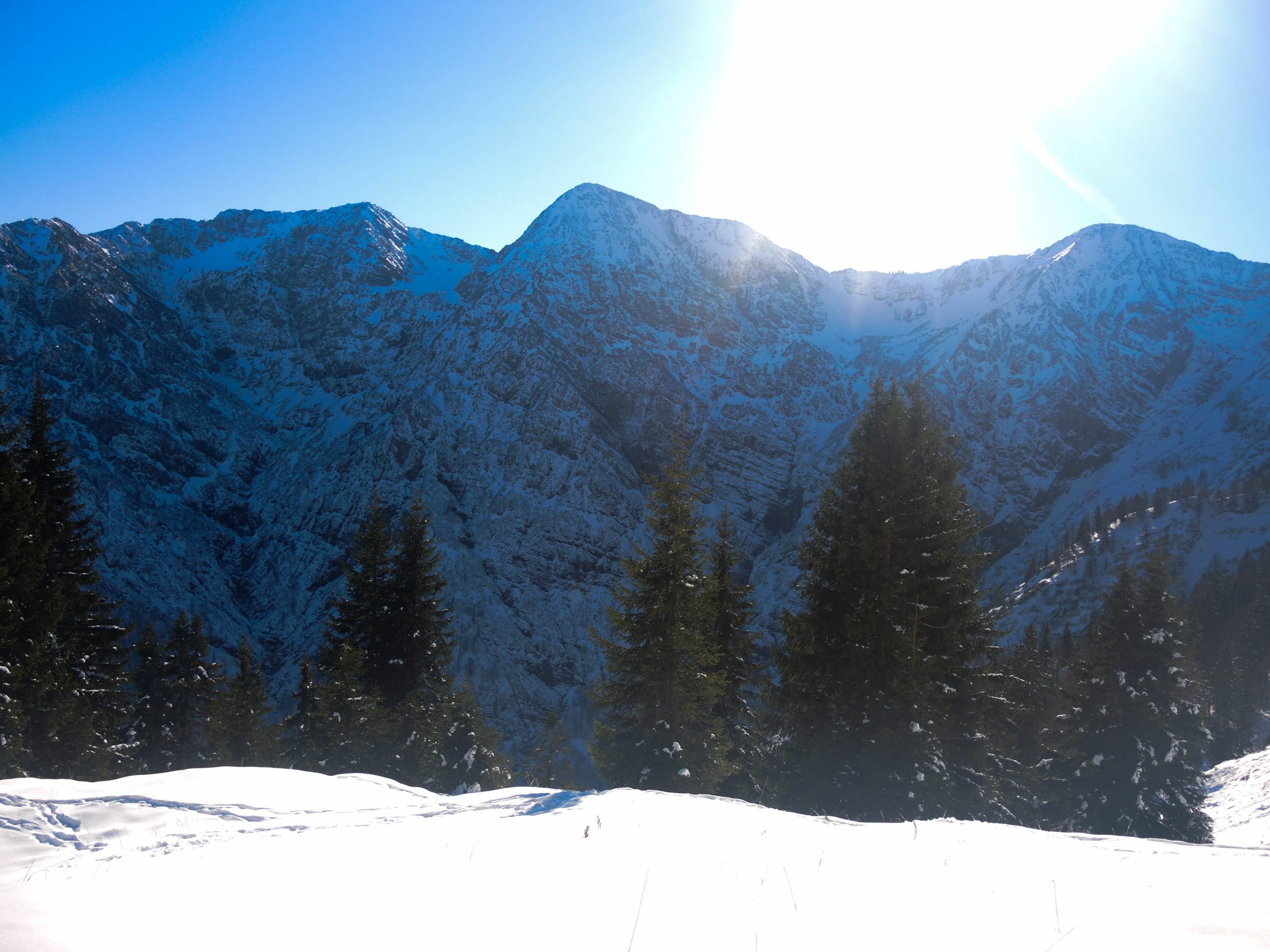 Jäh werde ich aus meinen Gedanken gerissen. Das Schürpfeneck kommt in Sicht, mit seinen 1623 Metern ein erstes Ausrufezeichen. Ab Walchenklamm hat man hier immerhin schon fast 900 Höhenmeter hinter sich. Ein Blick auf die Uhr zeigt, dass ich mich sputen muss, um noch Richtung Demeljoch zu kommen. Die Sonne senkt sich bereits, doch ich bin guten Mutes, dass ich – der vorhandenen Spur sei Dank – noch auf den Hauptgipfel komme.