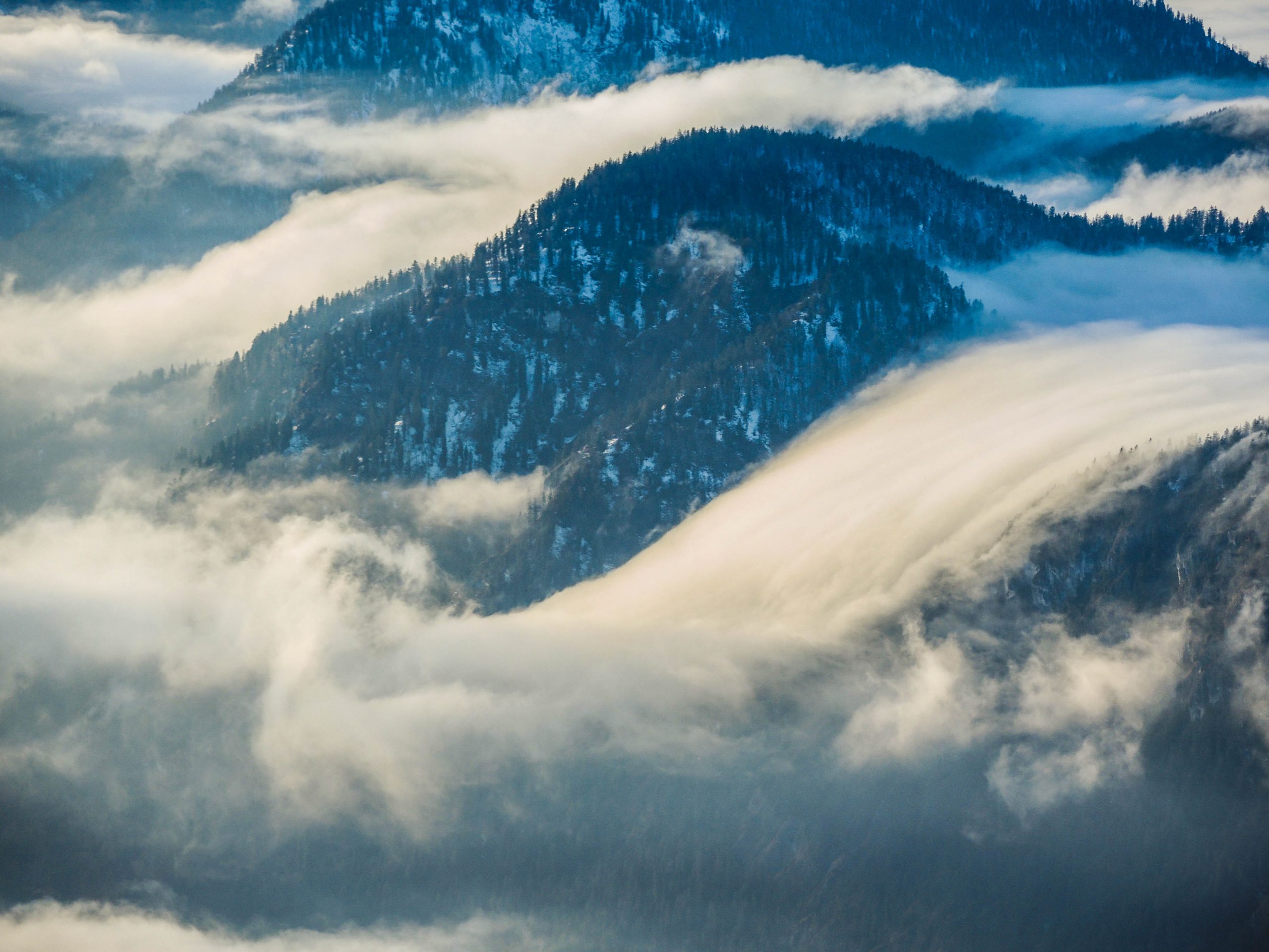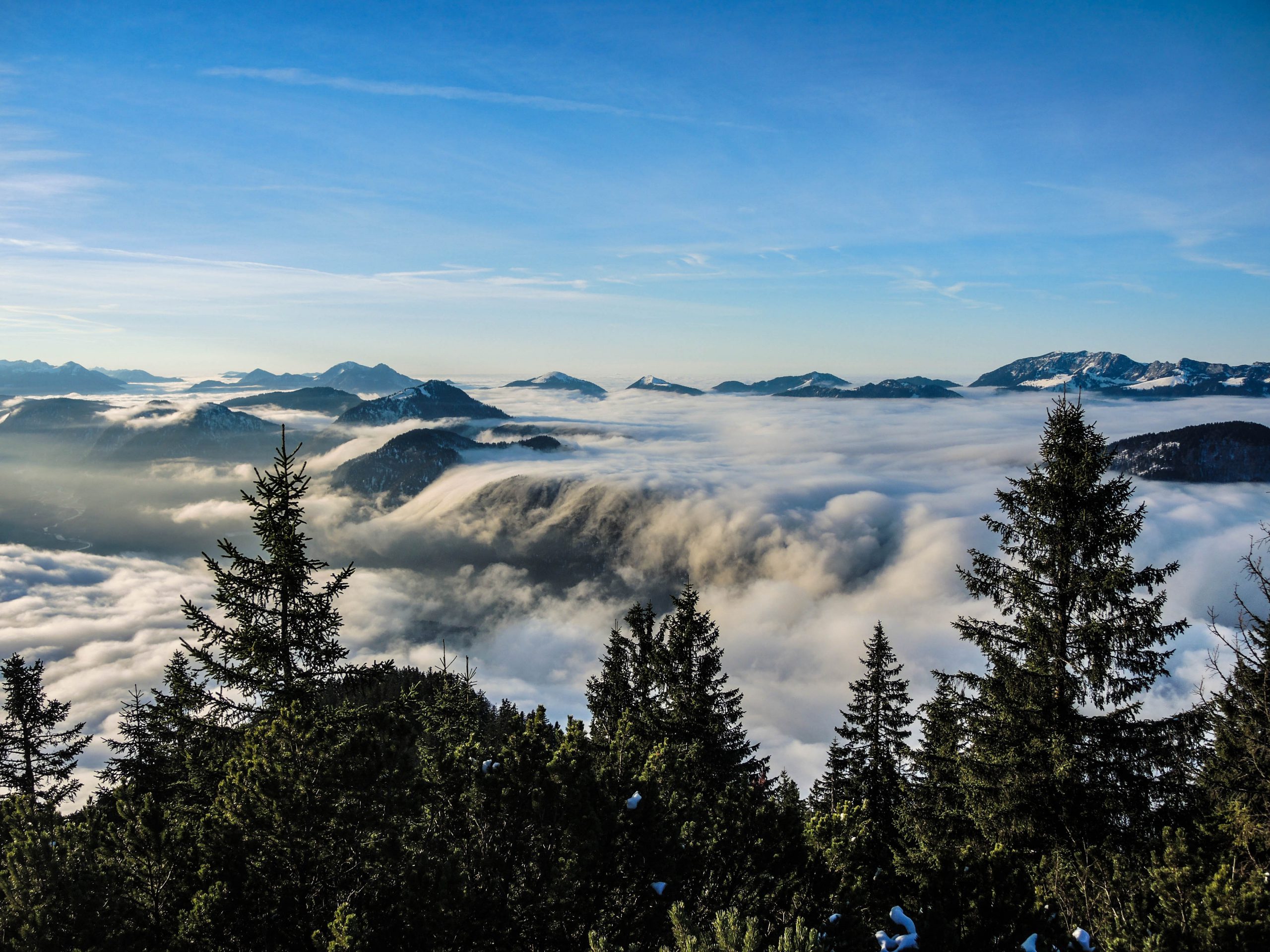 Siehe da – meinen Vorgänger haben wohl die Kräfte verlassen oder die Zeit ist ihm davongerannt. Seine Spur endet ungefähr 80 Höhenmeter unterhalb des Dürrnbergjoch-Gipfels und damit noch vor dem „Westgipfel“ des gesamten Demeljoch-Stocks. Ich bin jedoch (noch) gut drauf und wühle mich hinauf, mit zum Teil wunderschönen Blicken in die Demeljoch-Nordflanke. Ein Blick auf die Uhr macht jedoch auch mir klar, dass ich heute nicht bis zum Hauptgipfel kommen werde. Es geht schon auf drei Uhr zu und ich habe keine Stirnlampe dabei. So belasse ich es heute beim Gipfel des 1835 Meter hohen Dürrnbergjochs, genieße die traumhafte Sicht und stapfe alsbald wieder zurück Richtung Hühnerberg. Eine atemberaubende Stimmung stellt sich ein, die herannahenden Hochnebelfelder schieben sich wie überdimensionierte Schlagsahne über die Vorberge Richtung Isartal. Ich atme mehrmals tief ein und mache mich auf den Weg zurück in den Nebel….