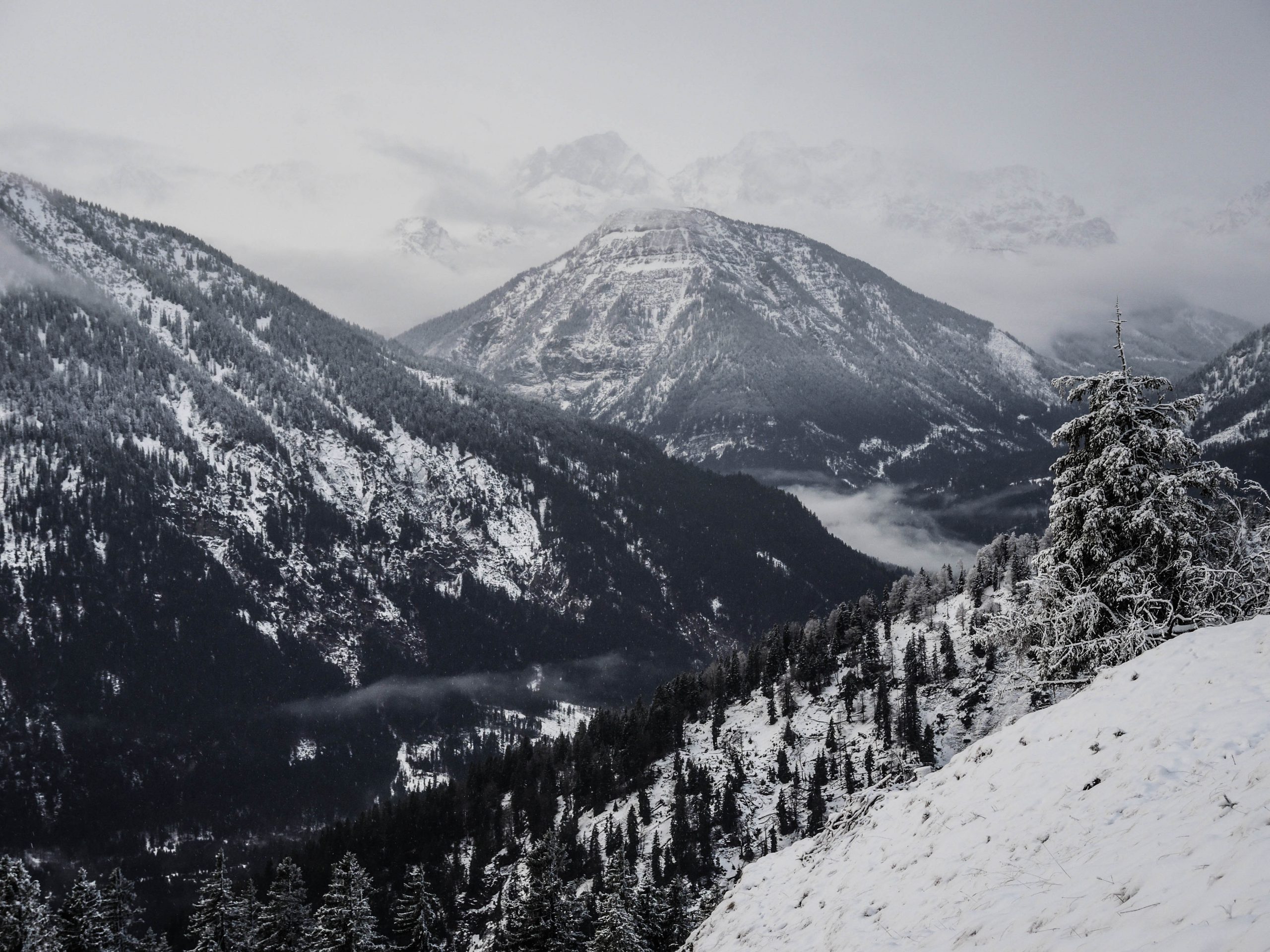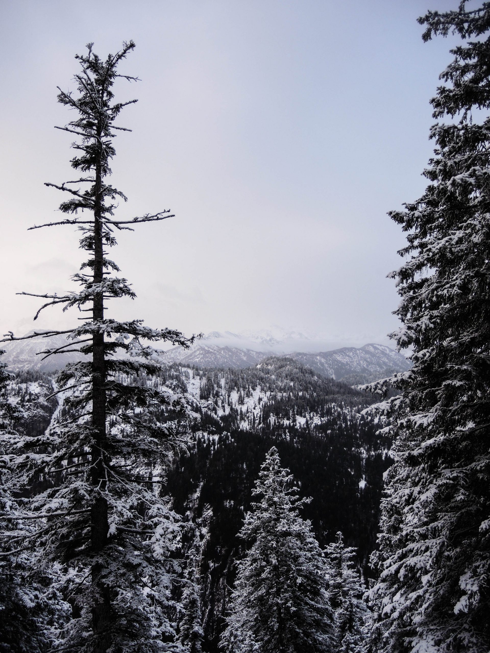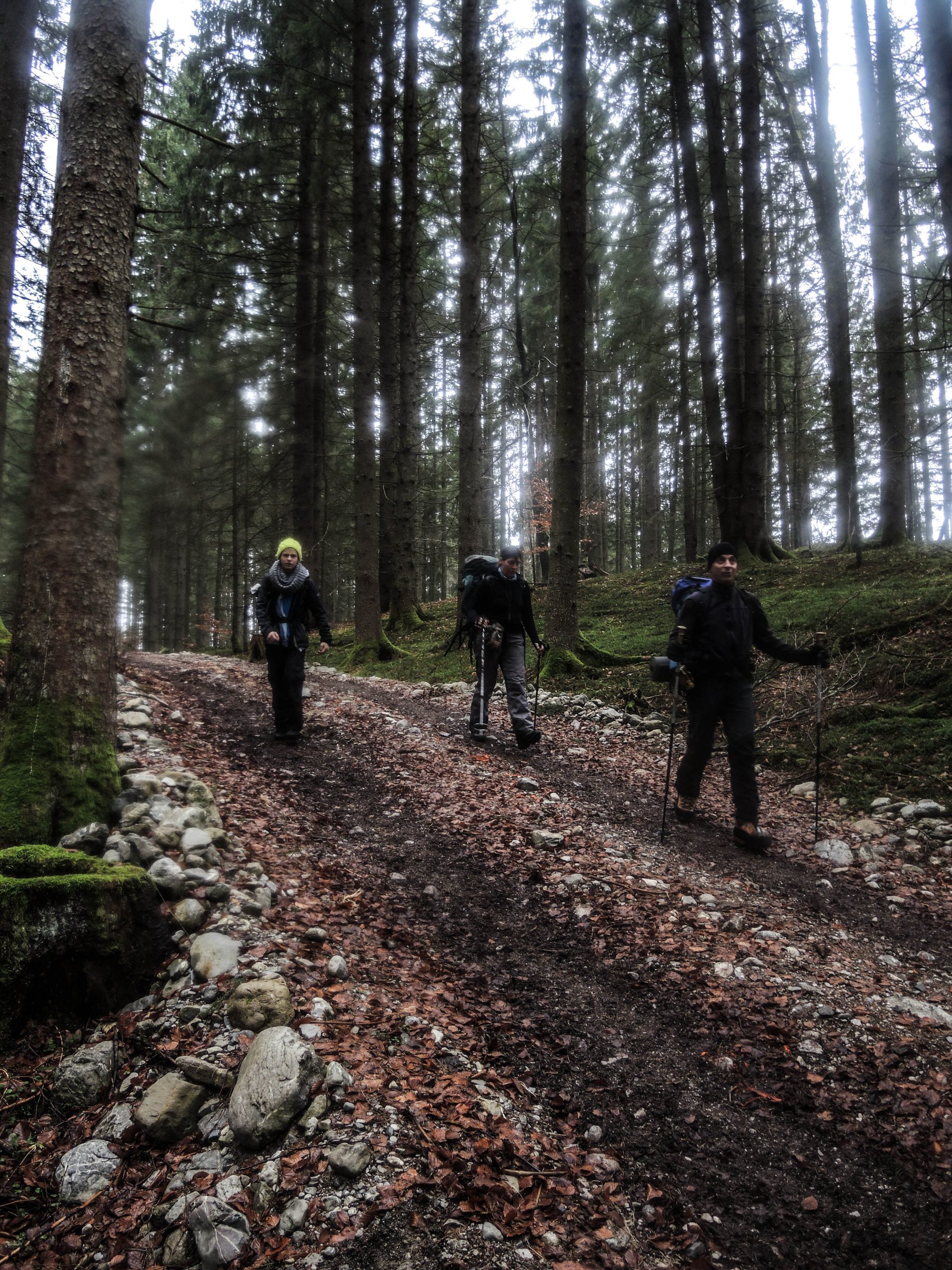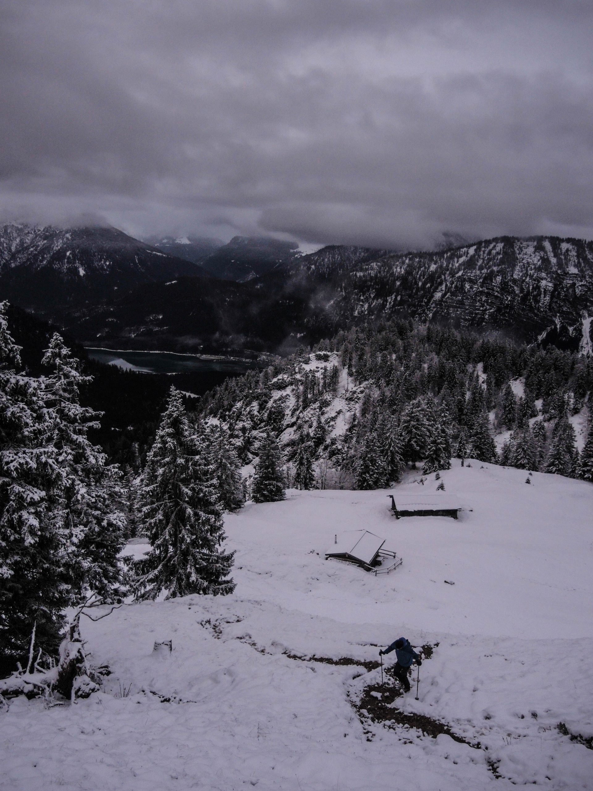 Nachdem wir nach dem Frühstück schon abgebaut und gepackt hatten, waren wir im Nu auf dem Weg Richtung Tal – diesmal auf dem Westweg. Verträumt liegen die Almen im Schnee eingebettet da, zauberhafte, einsame und leise Stimmung über Tälern und Bergen. Bis zum Wilfetsgraben war noch alles leicht beschneit, später, im Wald in Talnähe, grünes Moos und eine Stimmung wie im März.