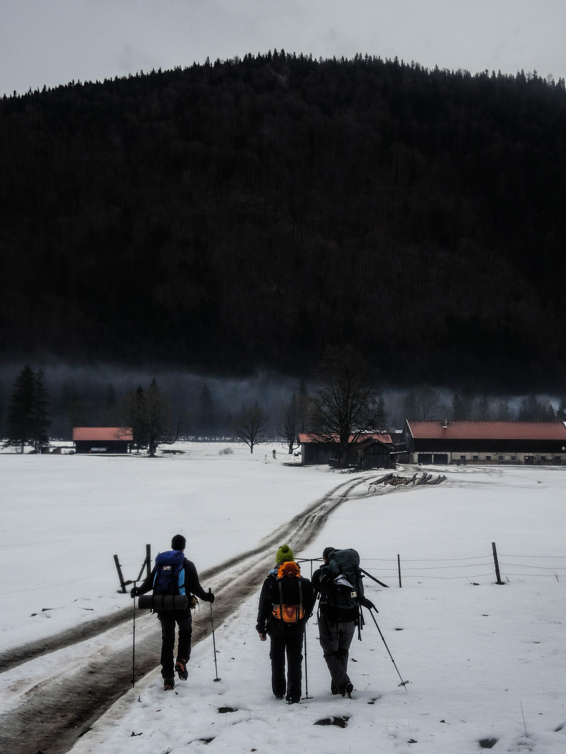 Bei Schneelage=0cm fuhren wir von Bad Tölz aus in die Jachenau, wenigstens in Niggeln hatte es noch 5cm, allerdings bockhart gefroren. Nachdem auch Felix samt Ronja eingetroffen war, ging es gegen 18:15 Uhr am Wanderparkplatz (742m) an der Jachenbrücke los. Die Rucksäcke waren ordentlich voll, hatten wir doch auch Brennholz für ein kleineres Feuerchen mit an Bord. Zudem stellte sich bald heraus, dass auch das Frühstück üppig ausfallen dürfte, da wir (fast) alle Frühstücksutensilien doppelt dabei hatten – kleiner Planungsfehler.