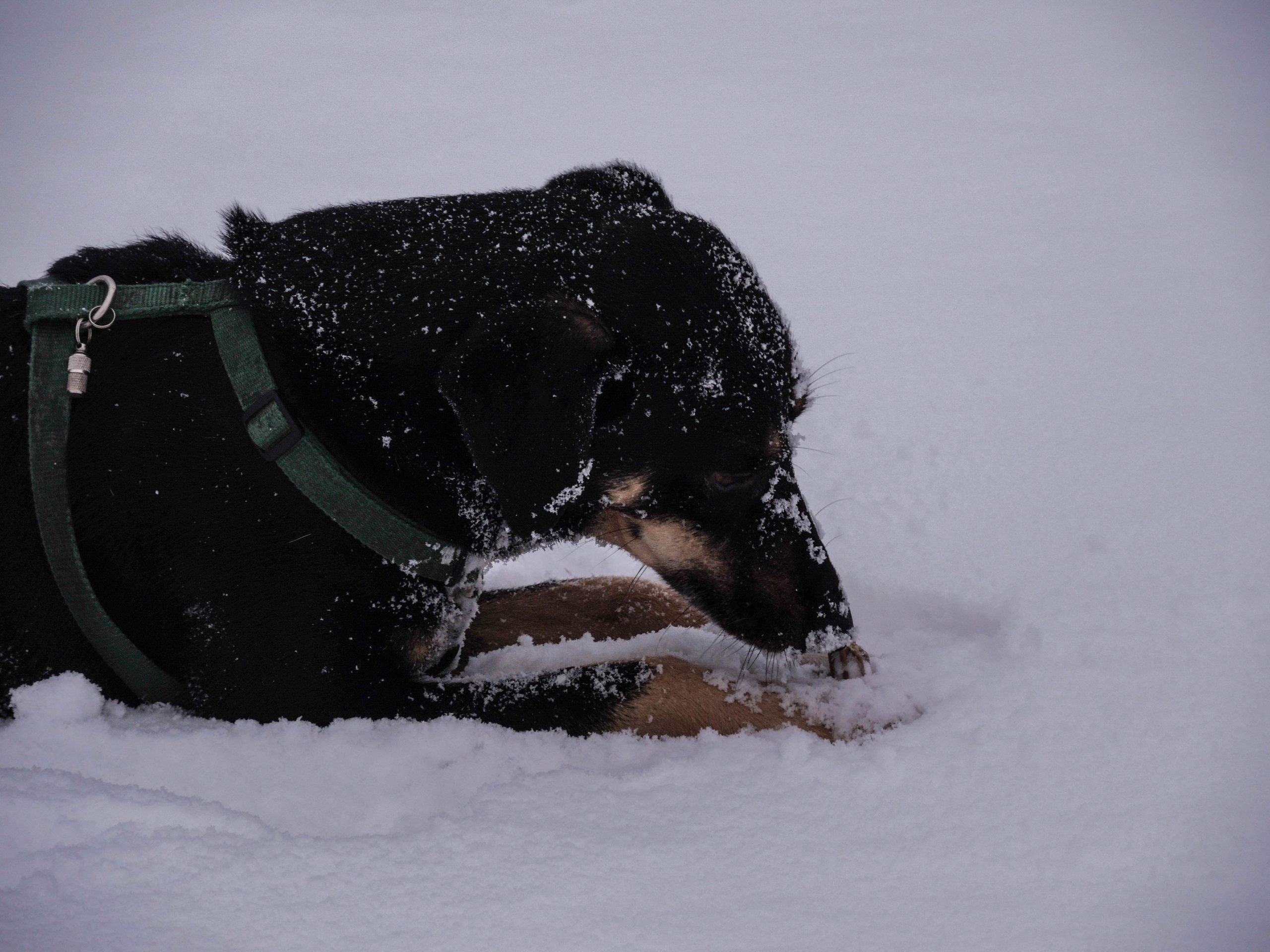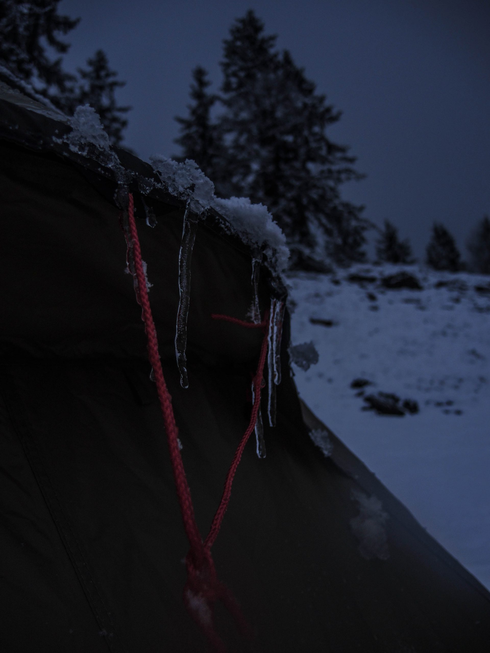 Nach einer traumhaften Mahlzeit inklusive köstlicher Keks-Nachspeise und ausgiebiger Sternenschau begaben wir uns gegen 23 Uhr langsam in die Zelte. Irml, Thimo und Urs ins 3er-Zelt mit der großen Apside, Felix, Ronja und ich ins MSR-2er. Wider Erwarten schlief Ronja kreuzbrav langgestreckt zwischen uns beiden und rührte sich nicht oder jedenfalls so wenig, dass man kaum etwas mitbekommen hat. Braver Hund – und offenbar keine Katzenträume. Kaum im Zelt, fing es leicht zu tröpfeln, dann zu trommeln und später zu knistern an – der Regen war bald in Schnee übergegangen und bei einem ersten Blick aus dem Zelt um 6:15 Uhr hatte es uns schön eingeschneit, knappe 10 Zentimeter dürften es gewesen sein.